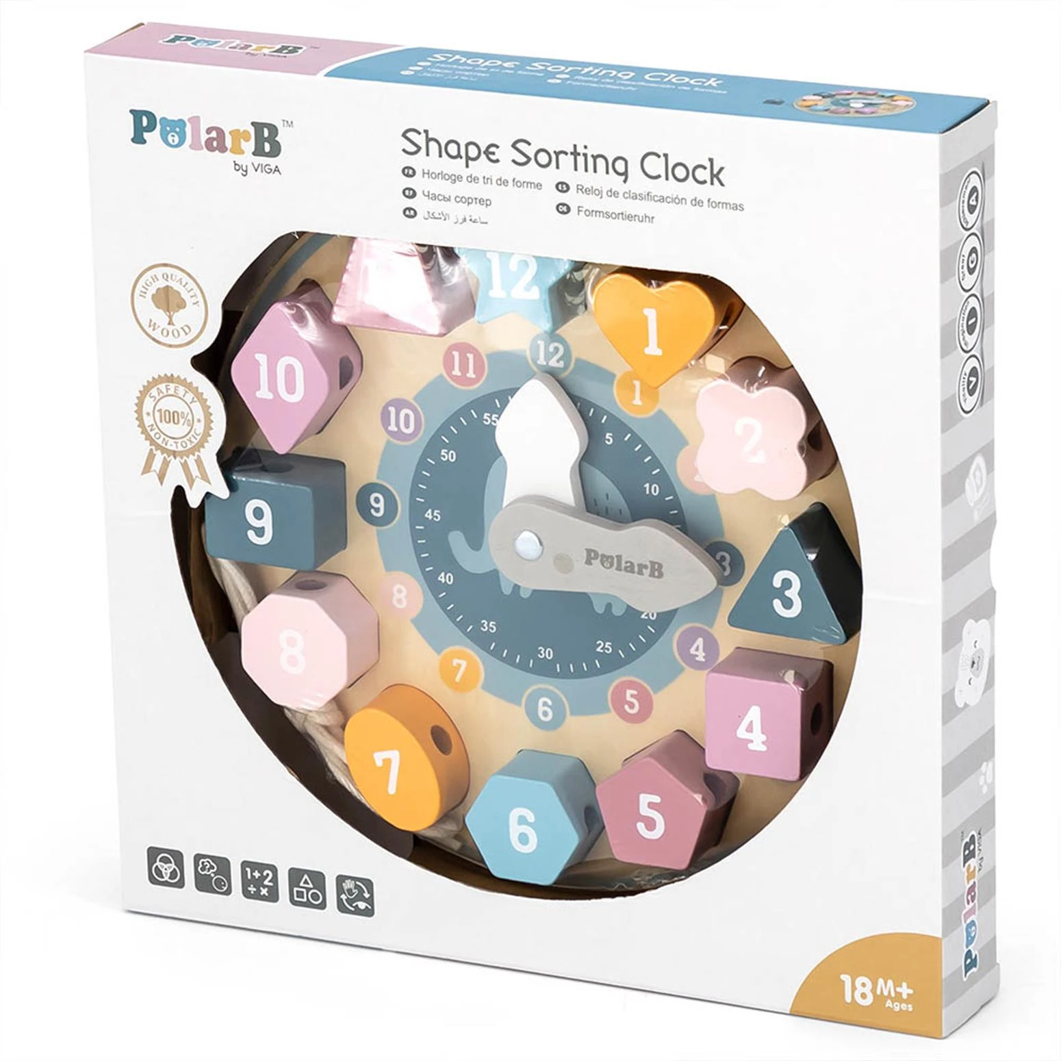 Acest ceas din lemn cu sortare de forme, având 12 piese numerotate ce se potrivesc, transformă într-o activitate distractivă de învățare. În plus față de învățarea despre ceas și timp, este și o jucărie puzzle pentru învățarea formelor geometrice.