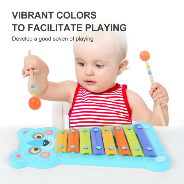 XILOFONUL este un instrument muzical de percuție format dintr-un set de discuri pe un suport, care sunt lovite cu bastoane. Lovind diferite discuri cu bețișoare de plastic, copilul scoate sunete diferite, învață să le combine, le pune în ritmuri și melodii.