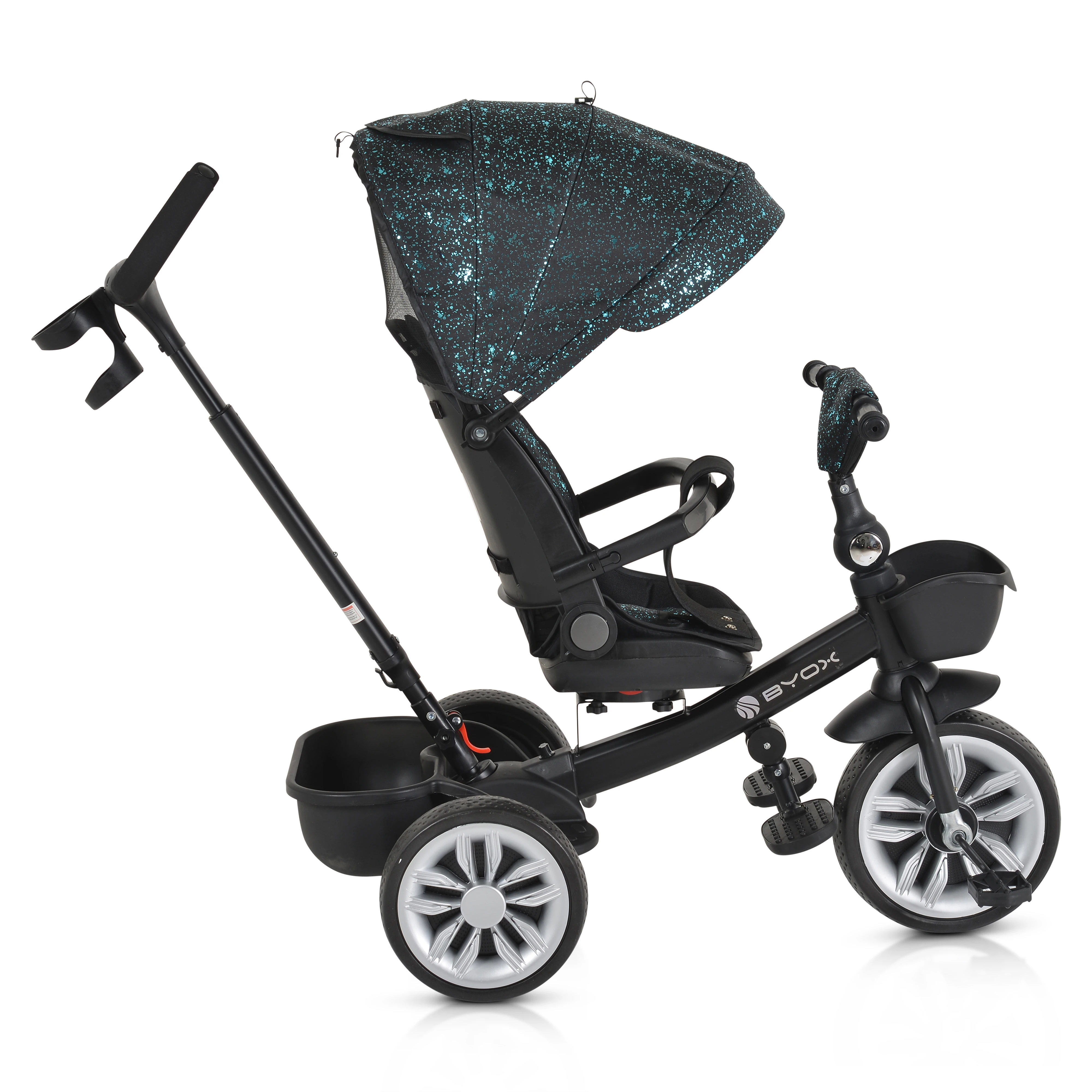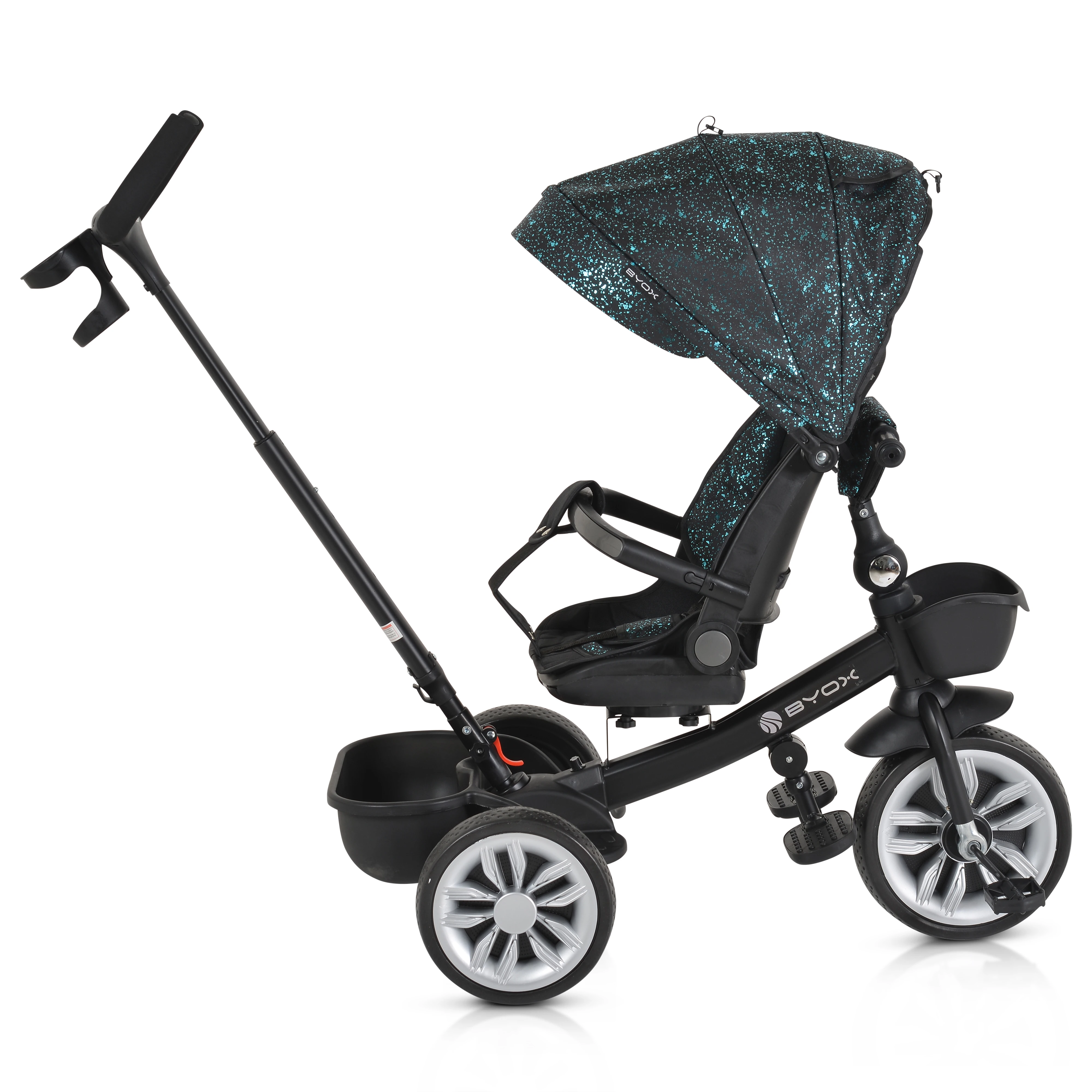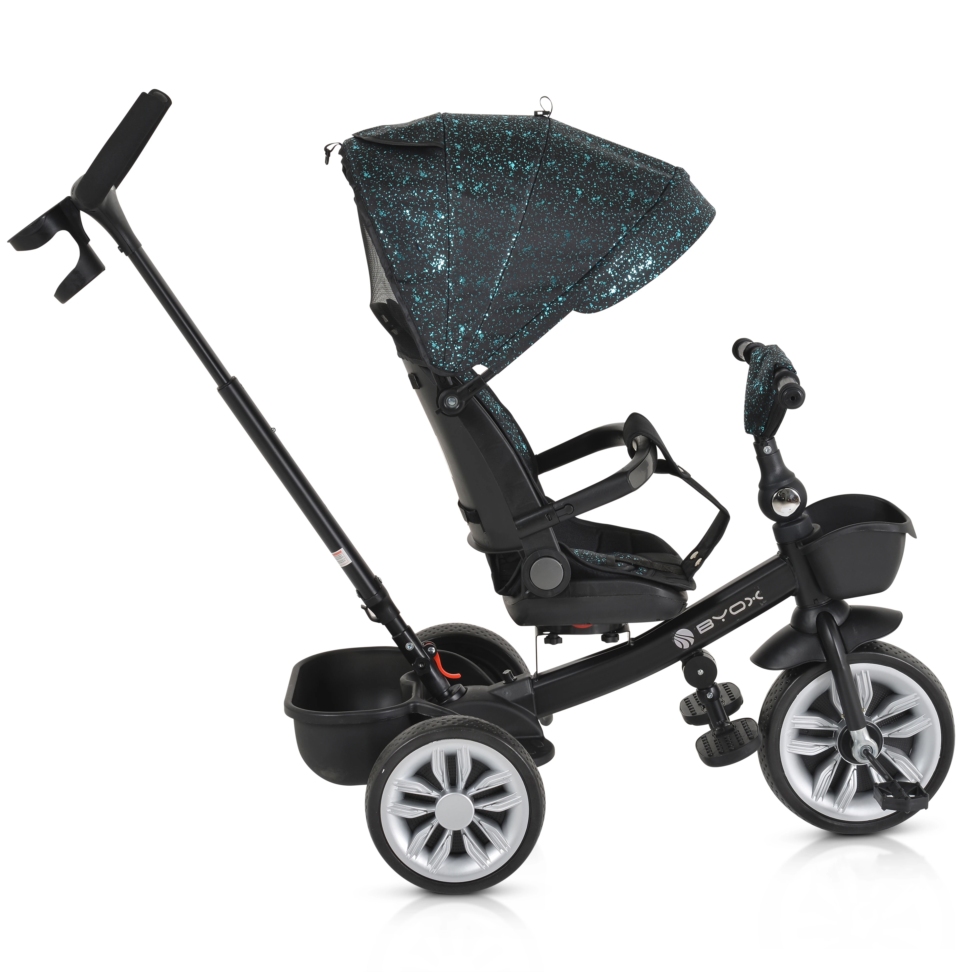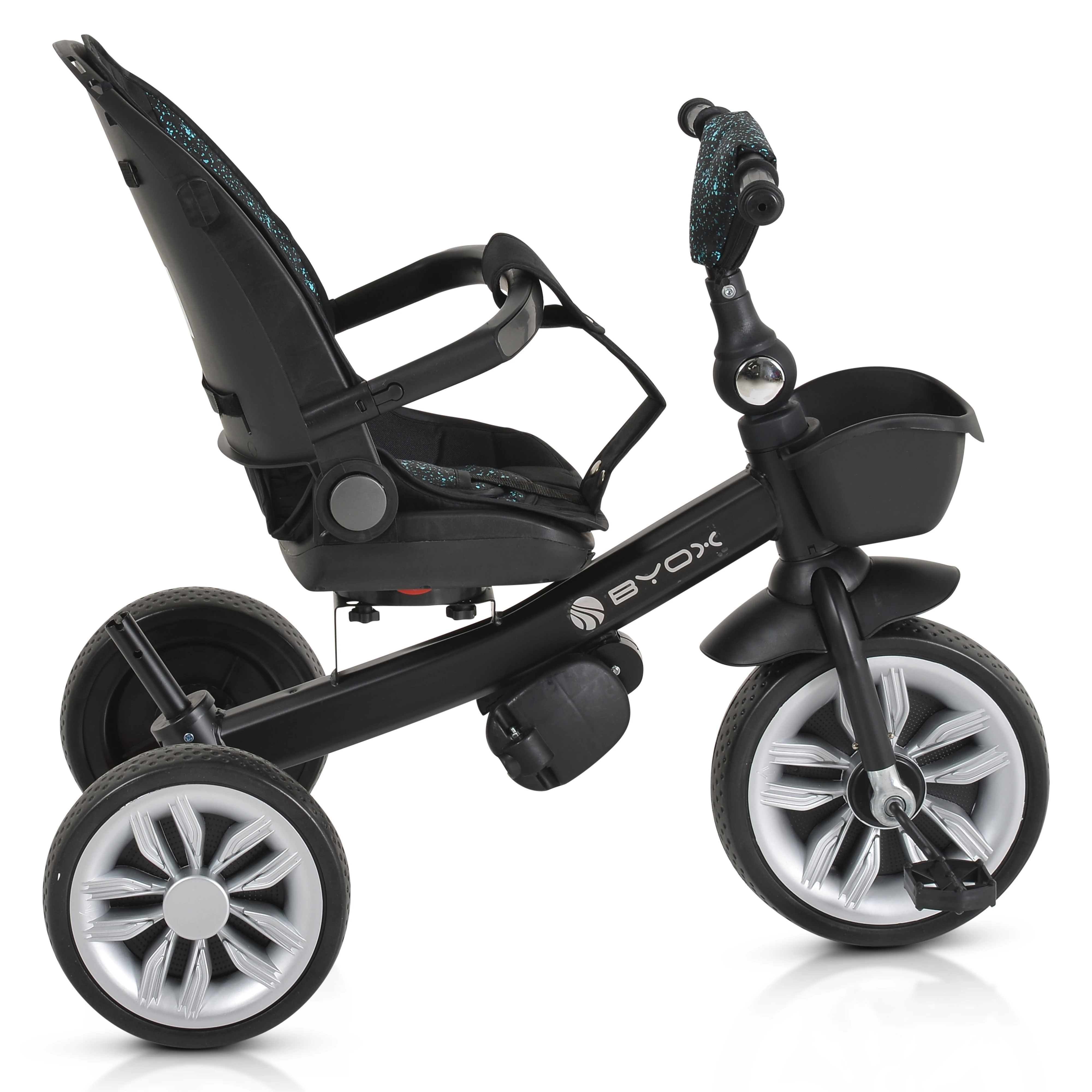 - Funcții: Ghidon pliabil, Spătar reglabil, Scaun rotativ la 360°, Mâner detașabil, Poate fi folosită și ca bicicletă cu 3 roți