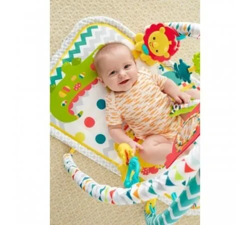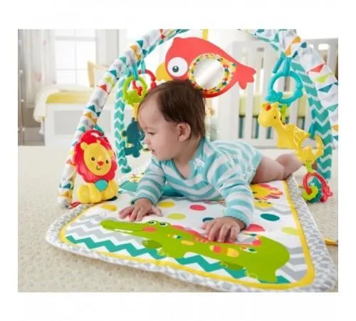 Micuțului tău îi va plăcea să se joace pe salteaua moale Fisher-Price cu șase jucării suspendate care se atașează la două arcuri moi. Setul include o oglindă de papagal, maimuță teether, trei zornăituri de animale, precum și un pui de leu prietenos cu două moduri muzicale - melodii scurte și lungi (până la 10 minute de muzică). Jocul pe covor dezvoltă abilitățile senzoriale, gândirea, abilitățile motorii fine și grosiere ale bebelușului. Căptușeala centrului de joacă se poate spăla cu mașina.