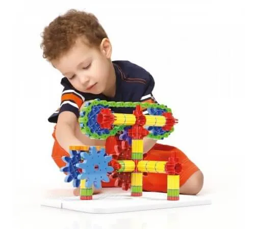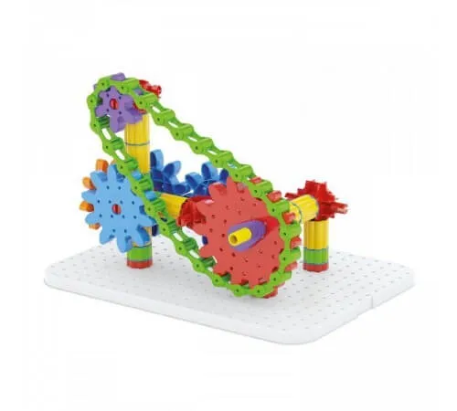 Construiți structuri 3D complexe, conectați angrenajele și puneți-le în mișcare într-o reacție captivantă în lanț! Acest sistem ingenios de construcție are un lanț de plastic care permite transmiterea mișcărilor între angrenajele neconectate. Un mod minunat de a învăța principiile mecanicii în timp ce te distrezi. Și toate acestea sunt complet nesigure și sigure.