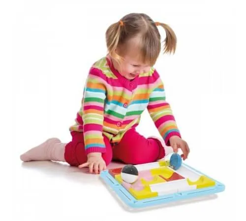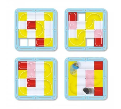 Puneți 16 elemente modulare în cadru, apoi faceți ca bilele să urmeze pista în direcția corectă și cu viteza corectă. Este amuzant și uimitor pentru copii să-și folosească degetele pentru a înclina pista și a vedea cum bilele se mișcă înainte, se opresc sau se rostogolesc, în funcție de cum lovesc marginea cadrului.
