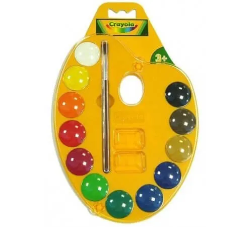 Vopsele acuarele de la companie americană Crayola pot fi pictate pe hârtie groasă și carton. Paleta este închisă cu un capac transparent care vă ajută să vă păstrați locul de muncă curat. Include o perie lungime de 13 centimetre. Pe paletă există un canal în care veți amesteca culorile și veți încerca diferite combinații. Vopselele nu scad luminozitatea atunci când sunt diluate cu apă.