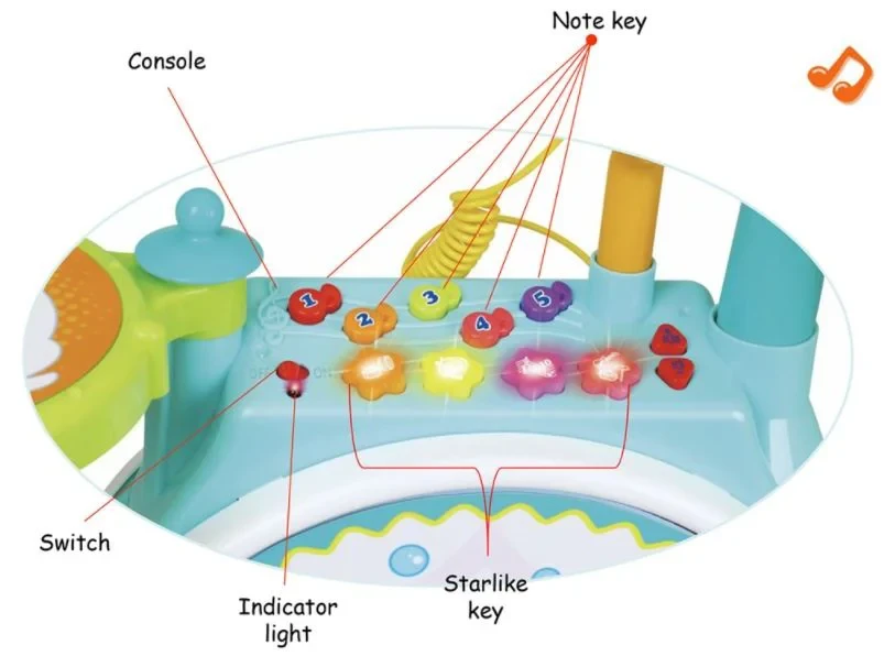 Descriere: Setul de tambur este echipat cu un tambur mare cu pedală și placă. Are melodii demo și ritmuri, efecte de însoțire ușoară.