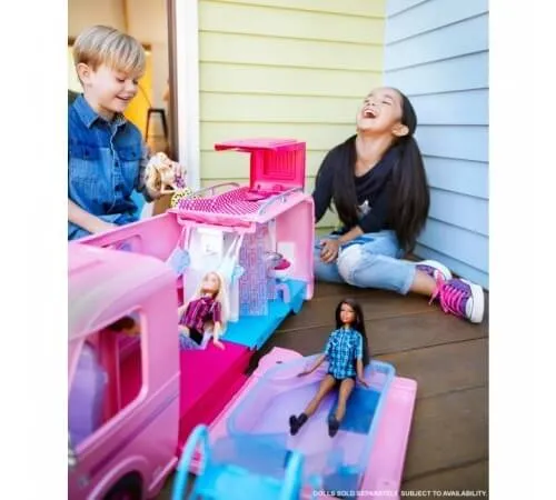 La volanul acestei remorci roz, Barbie este pregătită pentru orice aventură, deoarece această casă mobilă este mai mult decât pare. Transformați corpul într-o baie, vizitați bucătăria, care are frigider, chiuvetă și aragaz. Instalați piscina și conectați-o cu un tobogan la etajul al doilea. Puneți o masă și scaune pe terasă și luați o cină cu stelele. Păpușa nu este inclusă!