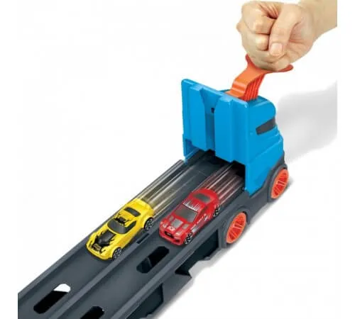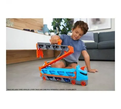 Mașinile care nu participă încă la competiție își așteaptă rândul sub pistă, iar cabina transportatorului se transformă într-un lansator dual, lansează două mașini pentru curse cot la cot. Câștigătorul continuă să concureze prin piese suplimentare legate de alte pachete Hot Wheels City (vândute separat). Mașina multifuncțională vine cu trei mașini Hot Wheels la scara 1:64 și poate găzdui până la 20 de mașini (vândute separat). Copiii de la 4 la 8 ani se pot juca fără sfârșit cu acest set. Culorile și aspectul pot varia