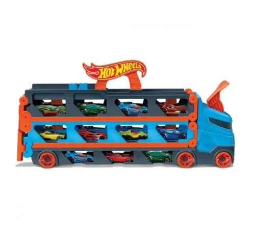 Hot Wheels Super Racing Transporter este atât o pistă de curse, cât și un transportator Hot Wheels într-un camion incredibil de plin de surprize. Prin ferestrele mici de pe camion, puteți vedea imaginea a mai mult de 20 de mașini Hot Wheels care pot fi transportate în el și, dacă trageți zăvorul din spatele transportorului, acesta se deschide, transformându-se într-o pistă de curse de 2 m lung!