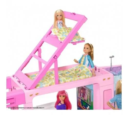După o zi lungă de aventuri în aer liber, trimite-i pe Barbie și surorile sau prietenele ei pe acoperiș - scoate un pat pentru Chelsea sau o altă păpușă - acolo pot dormi sub stele. Când sunt gata pentru următoarele aventuri, pliați totul în interior și închideți camperul pentru a ieși din nou pe drum. Un design distractiv, cu detalii realiste și grafică grozavă, fac aventurile rutiere atât de distractive! Cu 50 de accesorii, posibilitățile de joacă sunt nelimitate.
