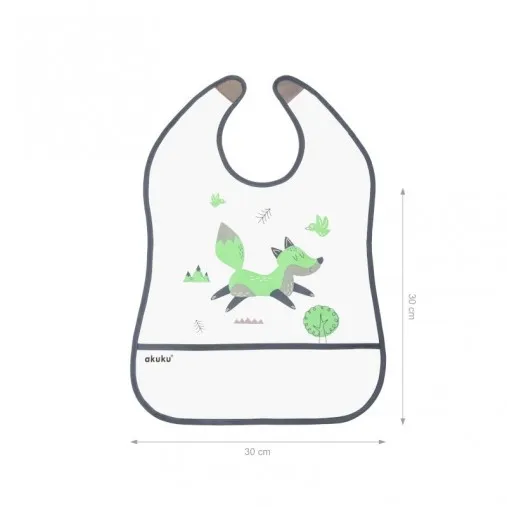 Baveta este prevăzută cu un buzunar mare care reține resturile de mâncare. De asemenea, are o închidere convenabilă cu velcro. Este ușor de o păstrat curată. Doar spălați baveta în apă caldă cu săpun imediat după masă.