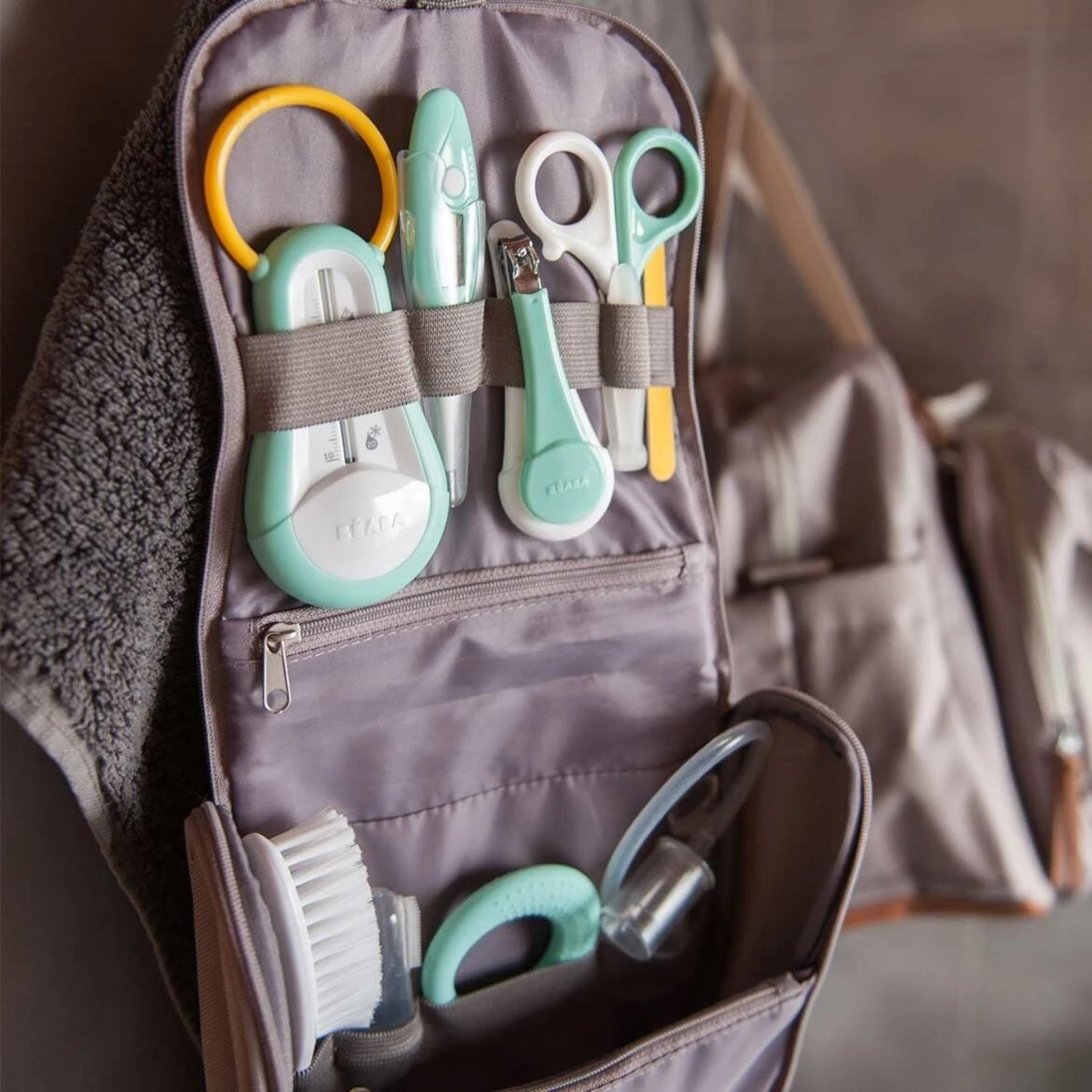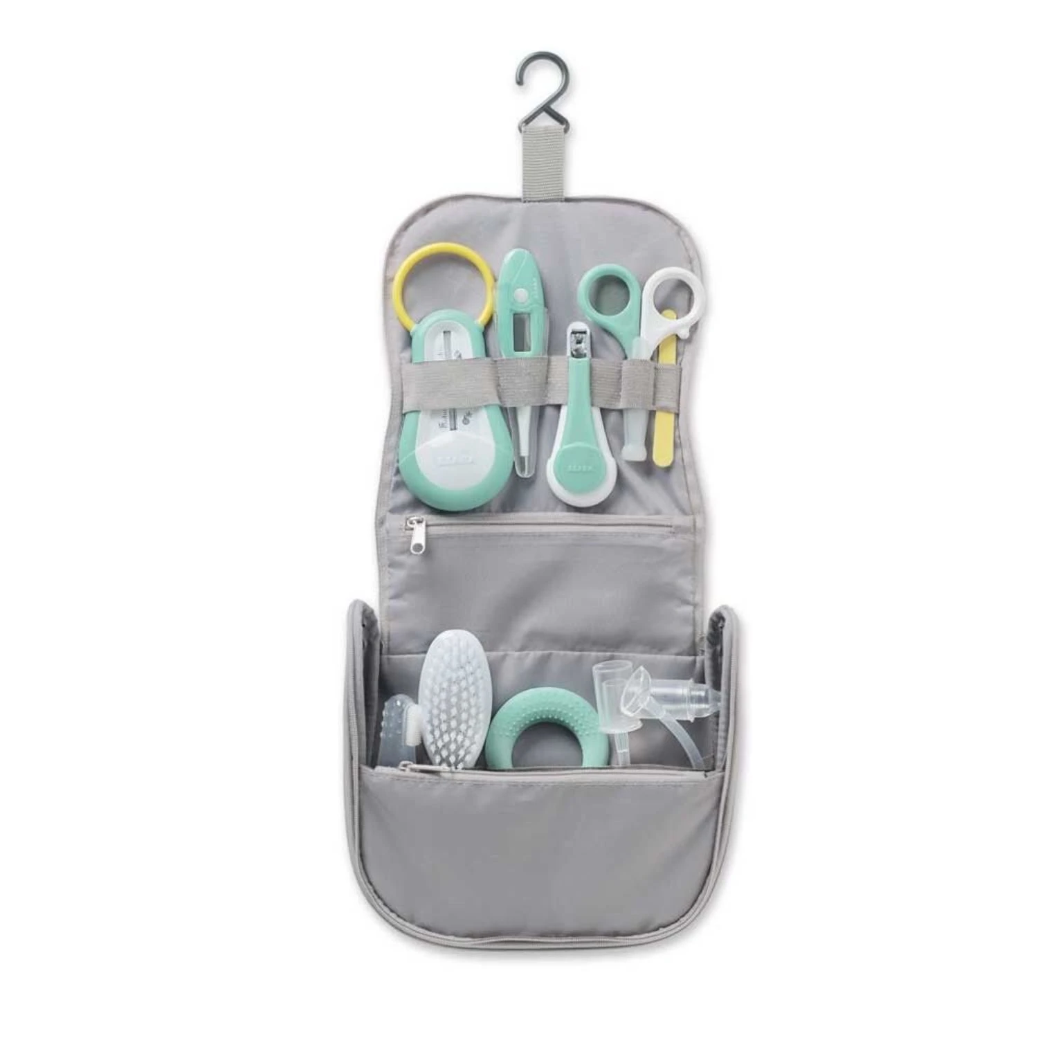 Setul este dotat cu 9 accesorii necesare pentru toaleta copiilor. Acesta este un kit ingenios, compact și foarte practic. Setul include termometru de baie, termometru digital, foarfece, unghieră, perie de păr, inel de dentiție, perie pentru masajul gingiilor, aspirator nazal și pilă de unghii. Setul de ingrijire poate fi utilizat de la naștere și până la adolescență, acesta conține toate accesoriile necesare pentru îngrijirea copiilor. Datorită numeroaselor compartimente de depozitare și a cârligului rotativ, setul este practic și adaptabil.