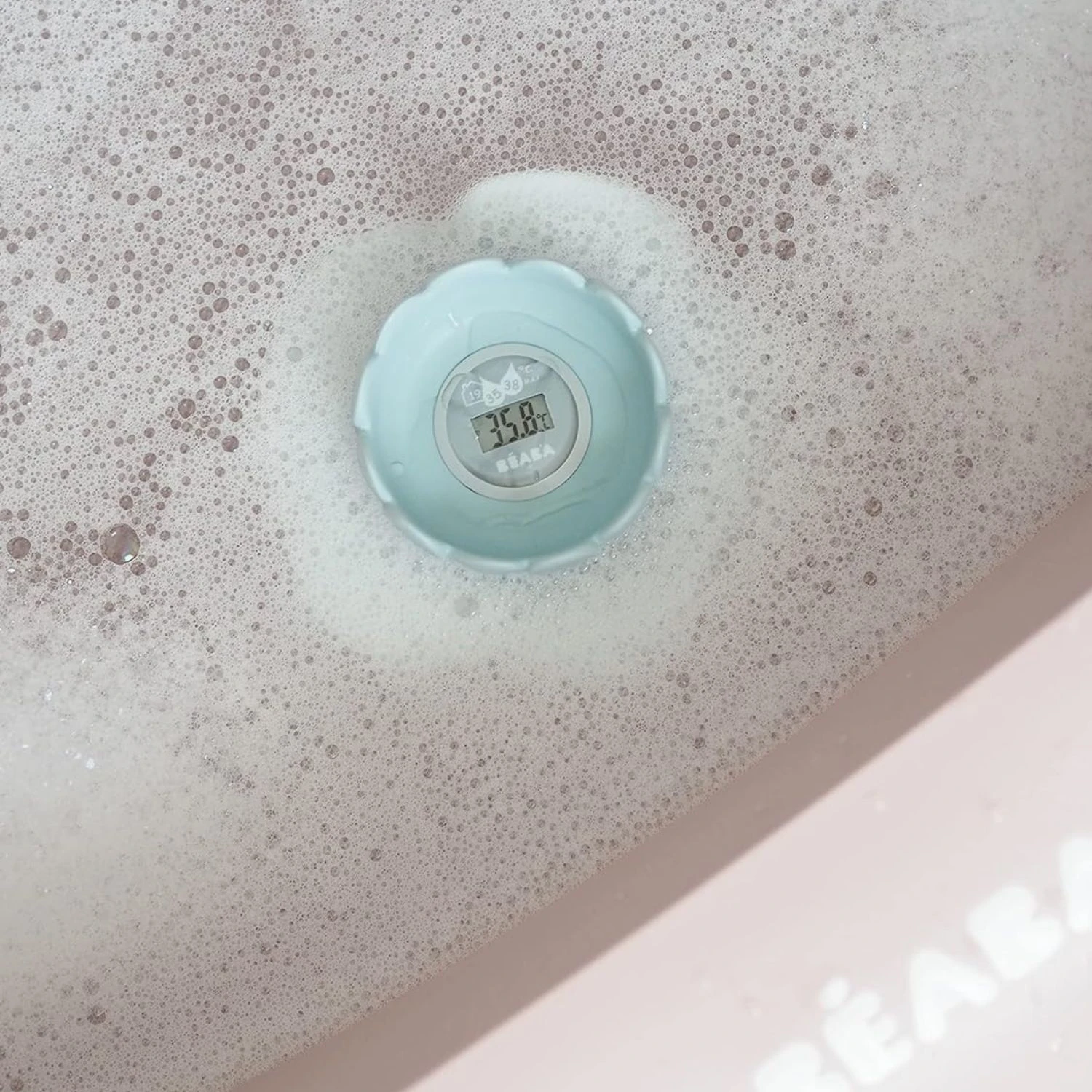 Termometru de baie Beaba Lotus asigură temperatura corectă a apei de baie - Ușor de citit datorită afișajului său digital. Forma lotus: plutește pe suprafața căzii și este distractivă pentru copil. Formă rotunjită și material moale: poate fi purtat în gură fără risc de rănire.
