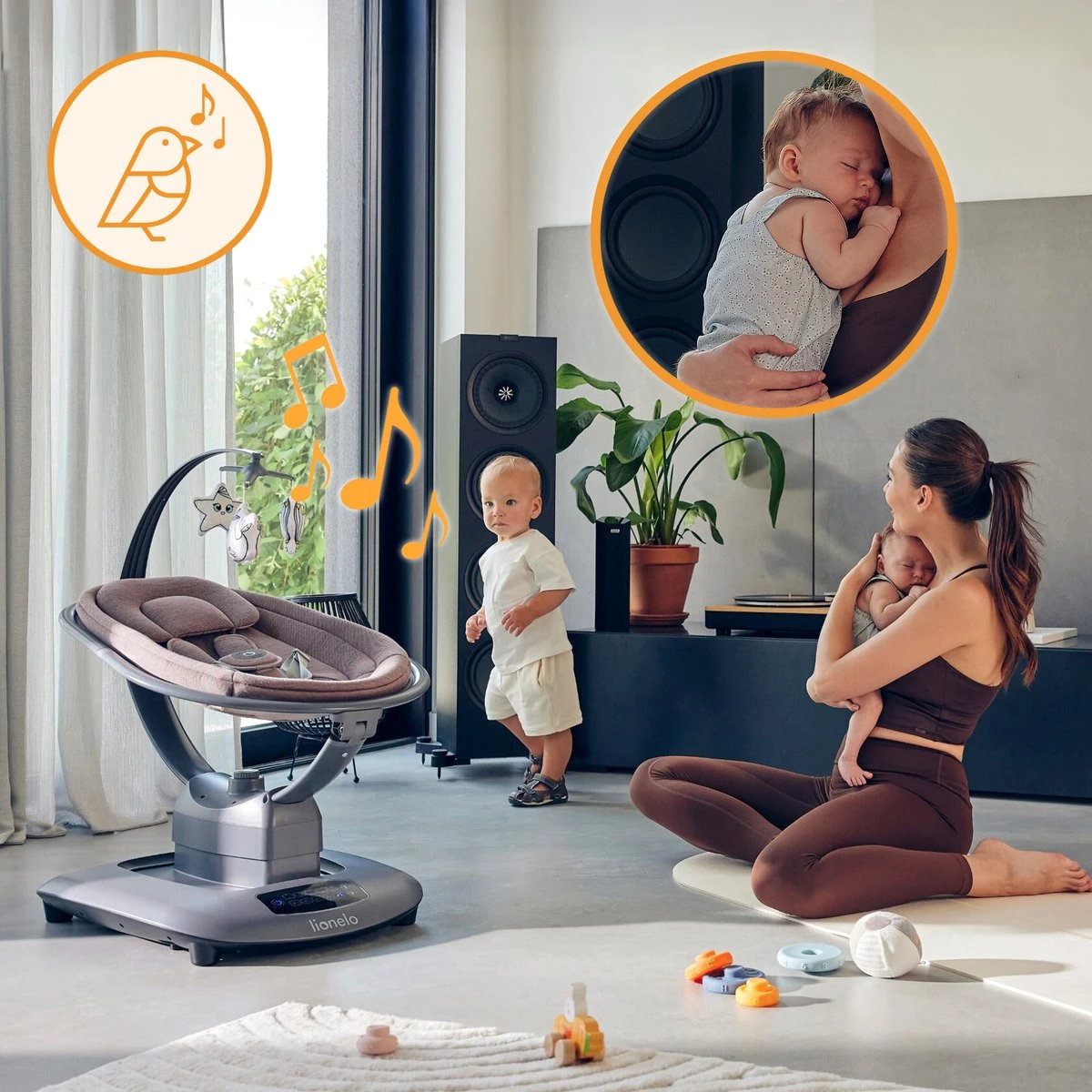 Cu ajutorul telecomenzii incluse în pachet, poți controla leagănul de la distanță – poți modifica viteza, volumul, tipul de legănare sau poți porni/opri sunetele fără să te ridici de pe canapea.