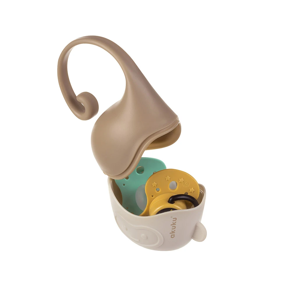 Un recipient practic pentru depozitarea suzetelor, oferind protecție eficientă împotriva murdăriei în timpul plimbărilor sau călătoriilor. Dimensiunea compactă permite transportul ușor într-o geantă, rucsac sau buzunar. Un mâner special în formă de coadă de maimuță permite atașarea comodă la cărucior, pătuț sau scaun auto. Poate conține 2 suzete. Culorile neutre se potrivesc cu orice stil.