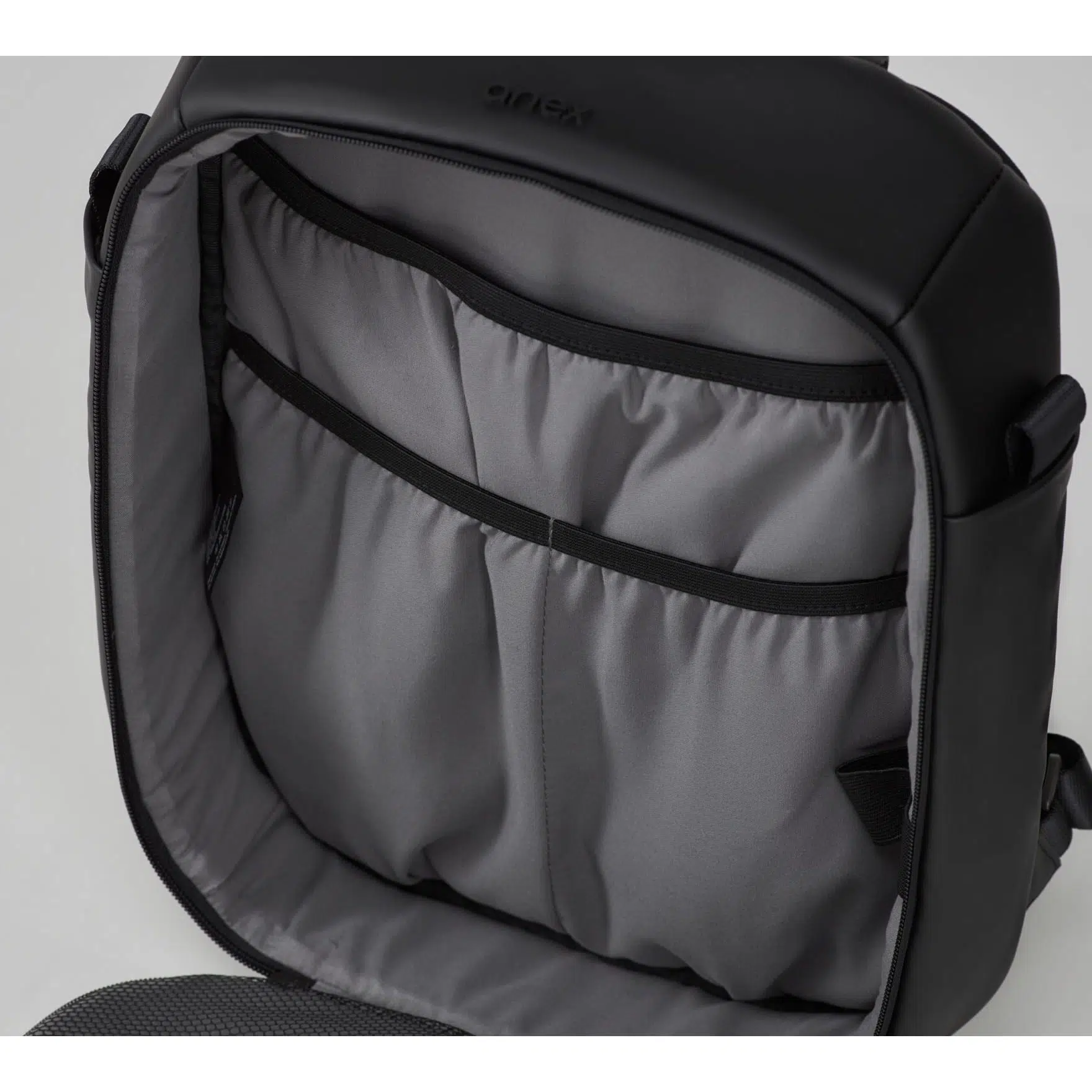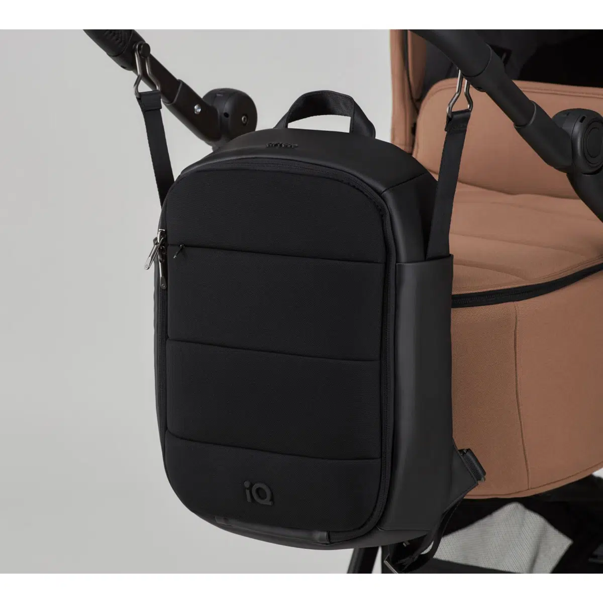 - Proiectat pentru a fi agățat pe un cadru IQ lat cu ajutorul unor cârlige speciale. De asemenea, rucsacul poate fi plasat cu ușurință în coșul căruciorului