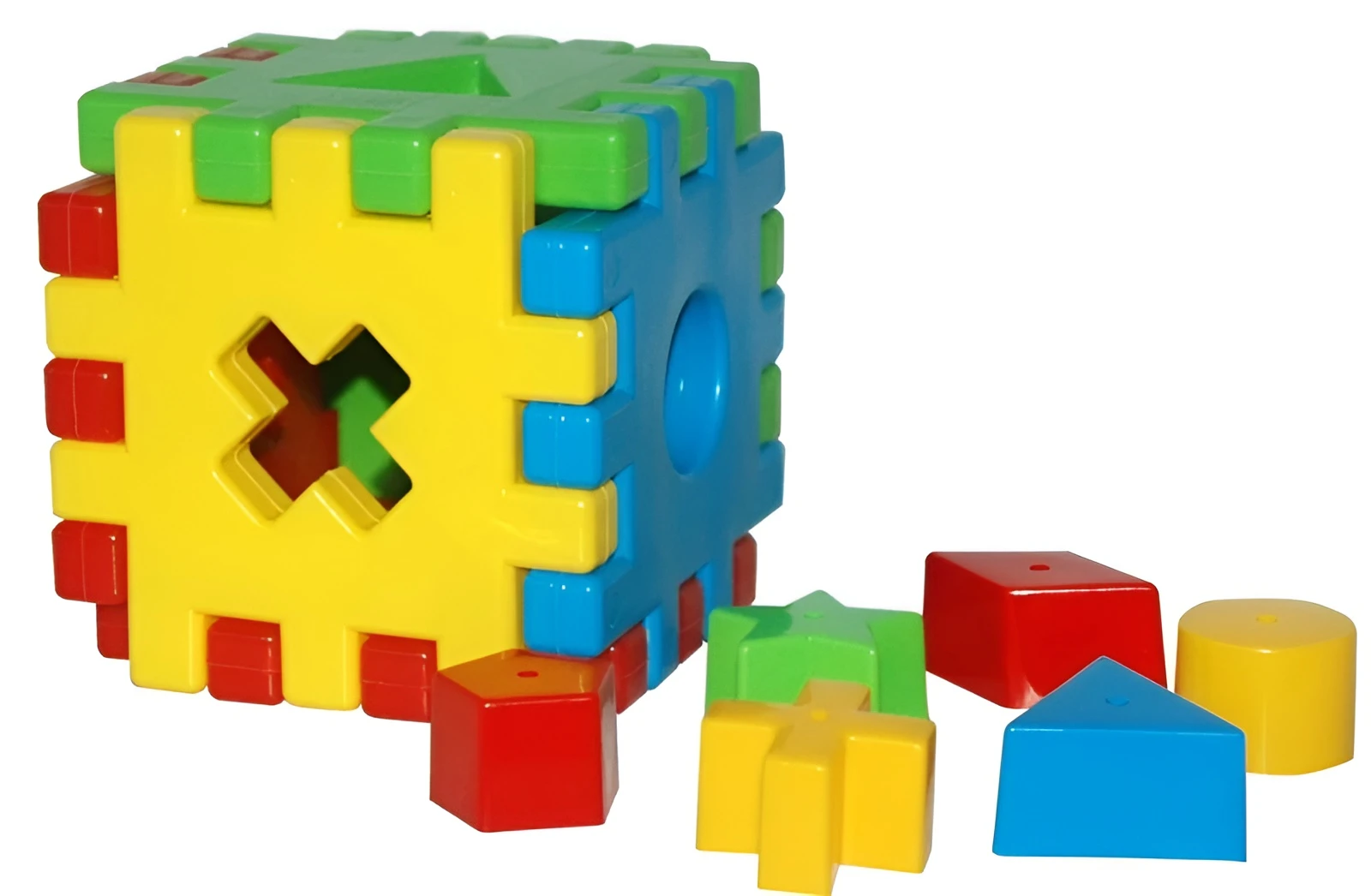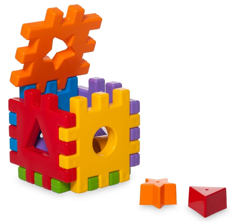 Fiecare față a cubului conține o gaură în formă geometrică, iar copilul trebuie să potrivească figurina corespunzătoare. Setul include 6 forme geometrice colorate, fiecare cu o formă diferită. Astfel, copilul învață să recunoască formele și culorile, să observe diferențele, dezvoltând memoria, logica, coordonarea și dexteritatea.