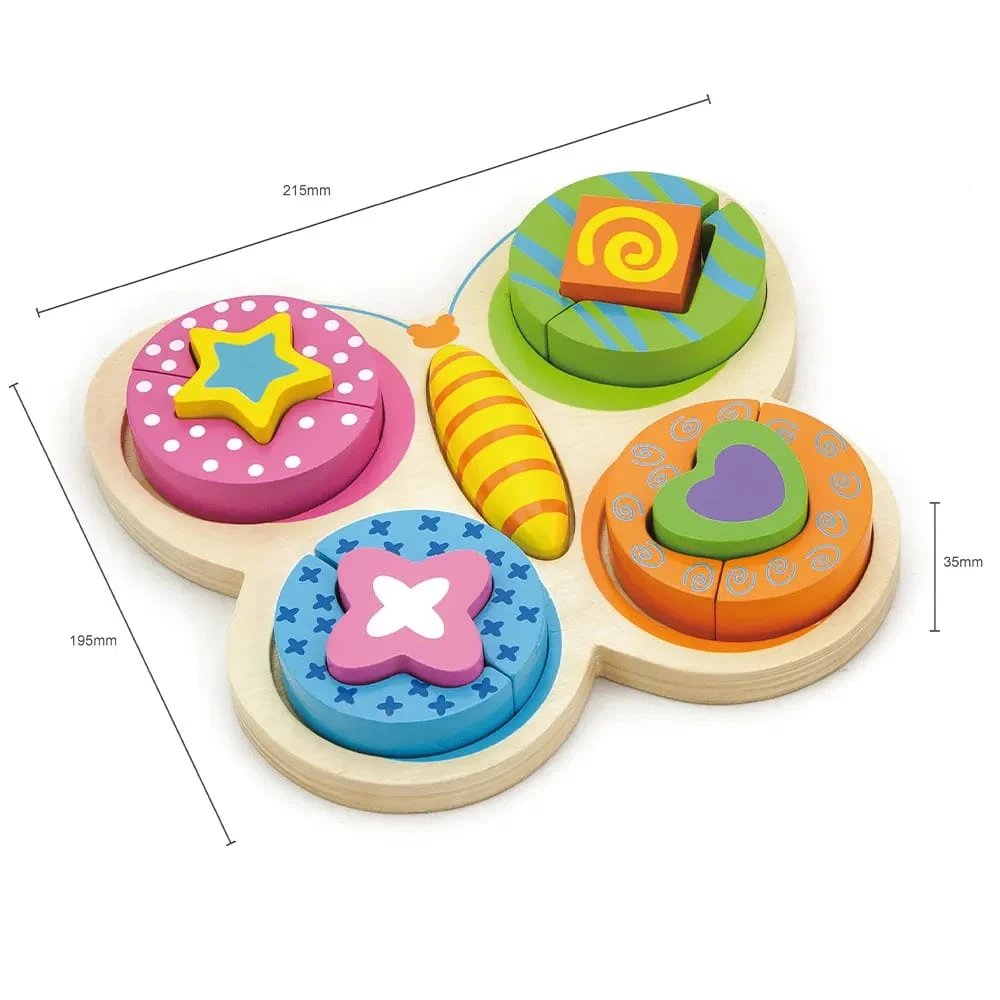 Puzzle fluture de la Viga Toys este o jucărie educativă unică, creată pentru copiii de la 2 ani. Designul său viu colorat, modelele interesante și formele neobișnuite vor capta imediat atenția copilului. Baza jucăriei este în formă de fluture și include 5 adâncituri: una ovală pentru corpul fluturelui și patru rotunde pentru aripi. Fiecare adâncitură are blocuri din lemn, care se montează sub formă de puzzle.