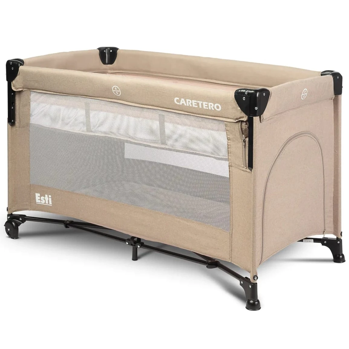 Pătuțul pliabil Caretero ESTI este proiectat pentru a facilita îngrijirea bebelușului. Cel mai mare avantaj este partea laterală pliabilă, care transformă pătuțul într-o prelungire a patului părinților, oferind astfel acces confortabil la copil. Mecanismul de pliere este simplu și rapid. Pătuțul are roți blocabile pentru deplasare ușoară. Capătul pătuțului este prevăzut cu fereastră cu fermoar pentru accesul copilului. Produsul este omologat conform standardului EN 716: 2017-07.
