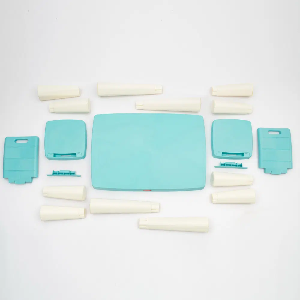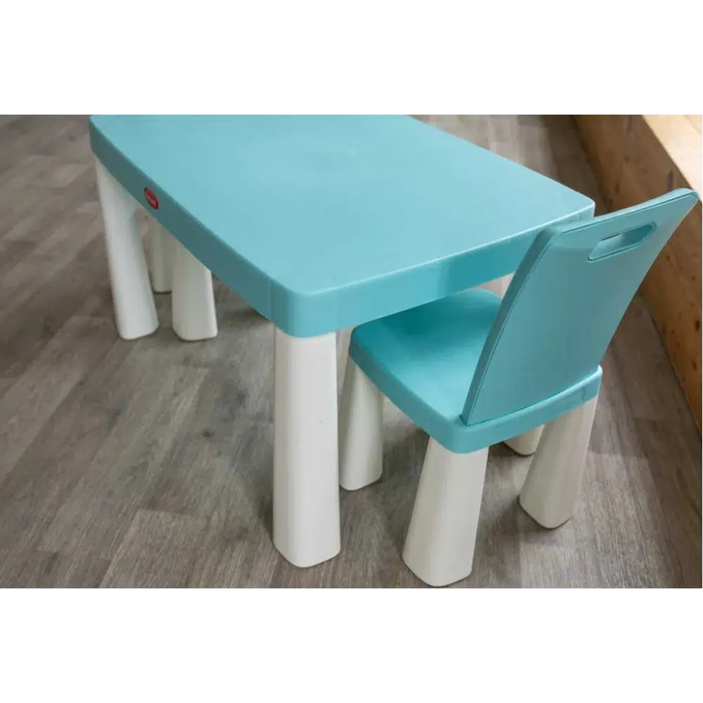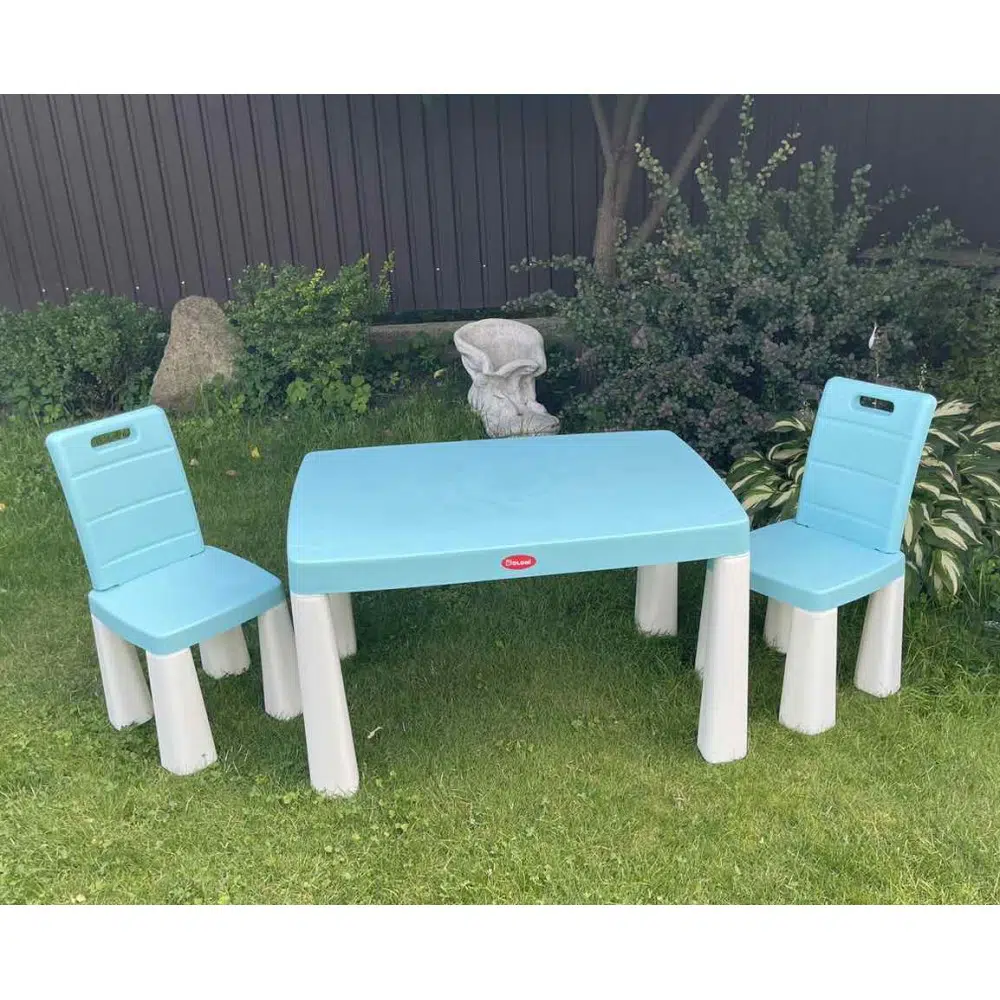 Setul de culoare turcoaz este format dintr-o masă pentru copii din plastic și două scaune pentru copii, tot din plastic. Scăunelele pot fi utilizate și ca taburete. La acest model, spătarul se poate scoate complet, iar în locul lui se poate monta un dop inclus în комплект.