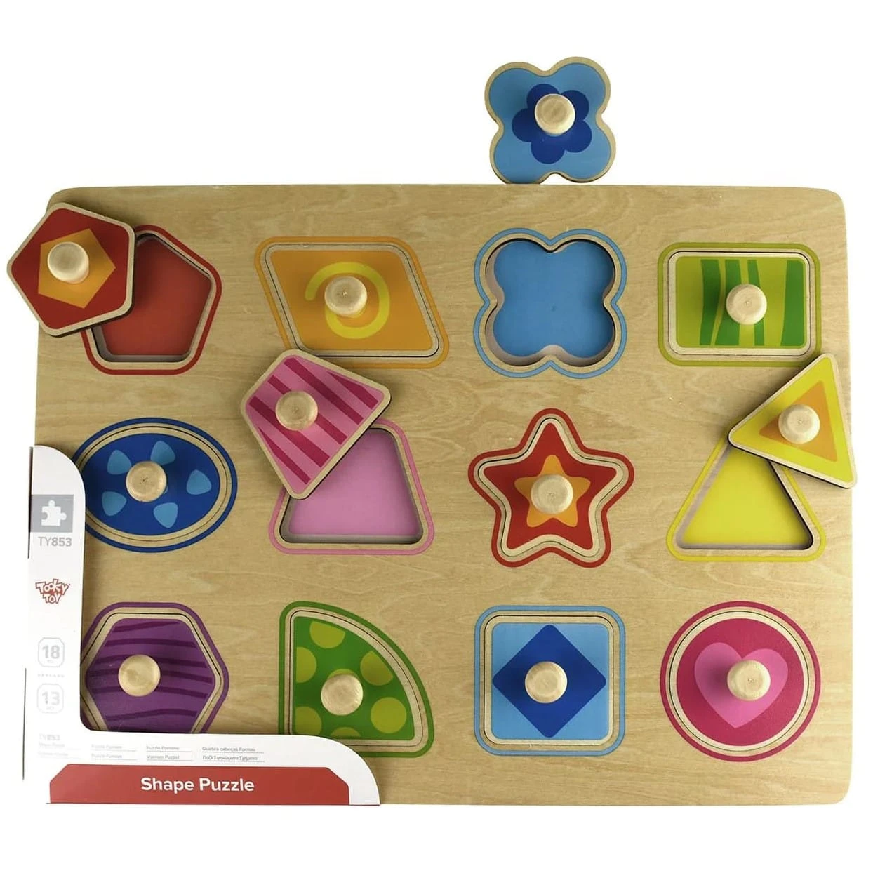 Puzzle-ul Figuri de la Tooky Toy este o jucărie educativă din lemn, ideală pentru copii cu vârsta de peste 18 luni. Acest set include o placă de lemn și 12 piese de puzzle cu mâner, fiecare piesă reprezentând o formă geometrică distinctă.