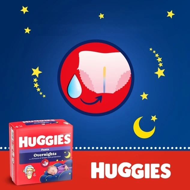 Încercați noii chiloței pentru noapte Huggies Overnights Pants și bucurați-vă de principalele lor avantaje: până la 12 ore de protecție și confort în timpul somnului.