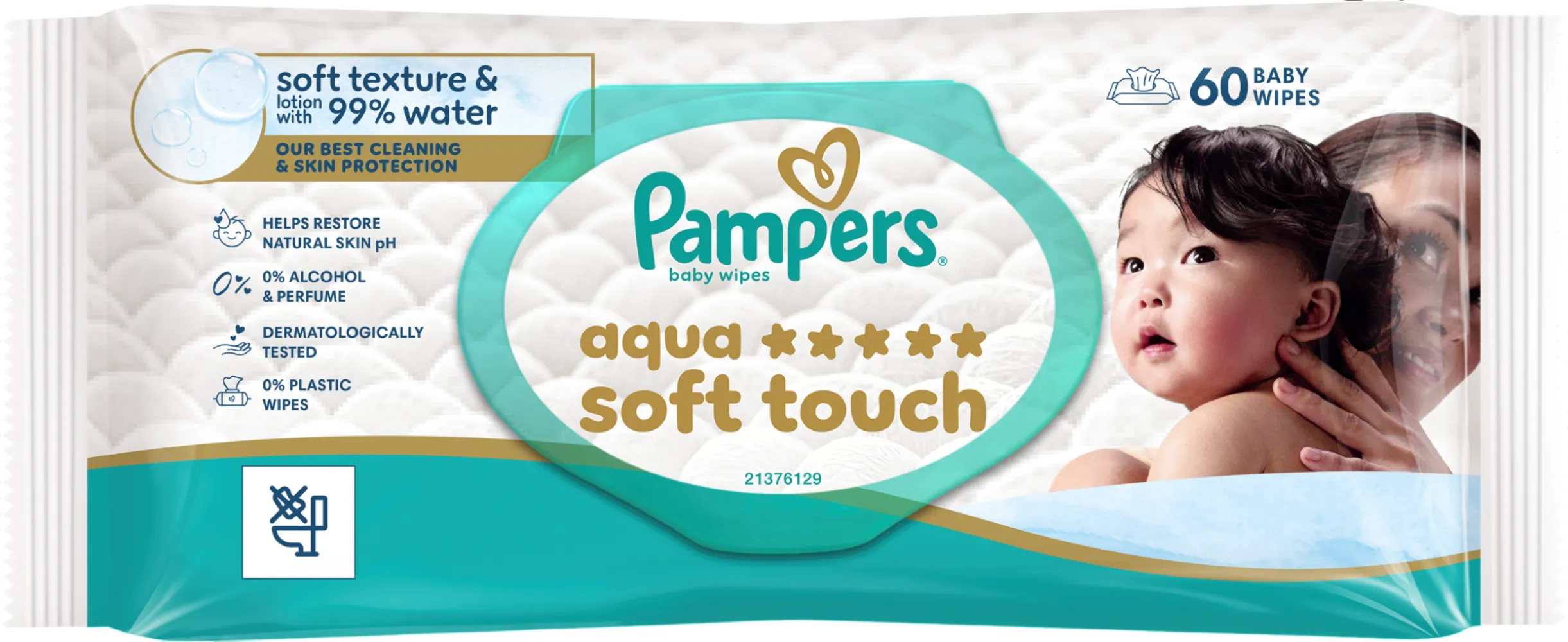 Șervețelele umede Pampers Aqua Soft Touch oferă o curățare delicată și sigură, special concepută pentru pielea sensibilă a bebelușilor. Formula blândă, bazată în proporție de 99% pe apă, ajută la menținerea echilibrului natural al pielii încă din primele zile de viață.
