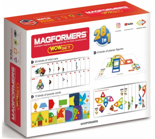 Setul include 20 de cărți tematice pe două fețe. Jumătate din cărți reprezintă 20 de mașini originale, fiecare dintre acestea putând fi asamblate din elementele acestui set. Cealaltă jumătate a cărților demonstrează clar principiul de proiectare de la Magformers.