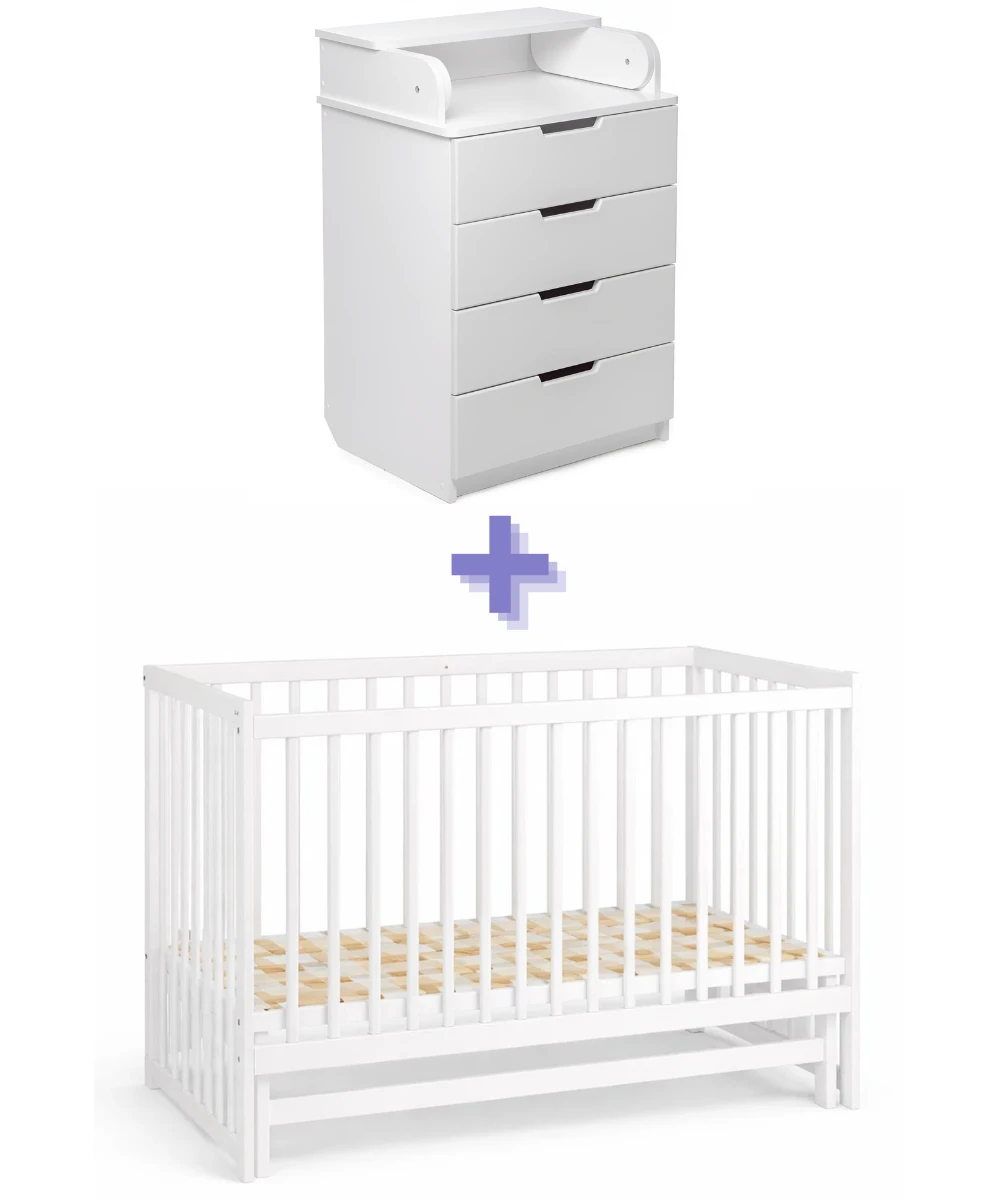 Amenajează camera bebelușului complet și armonios cu un set practic format din pătuț din lemn natural și comodă multifuncțională cu masă de înfășat. O combinație ideală pentru părinții care își doresc siguranță, organizare și un design modern în nuanță albă universală.