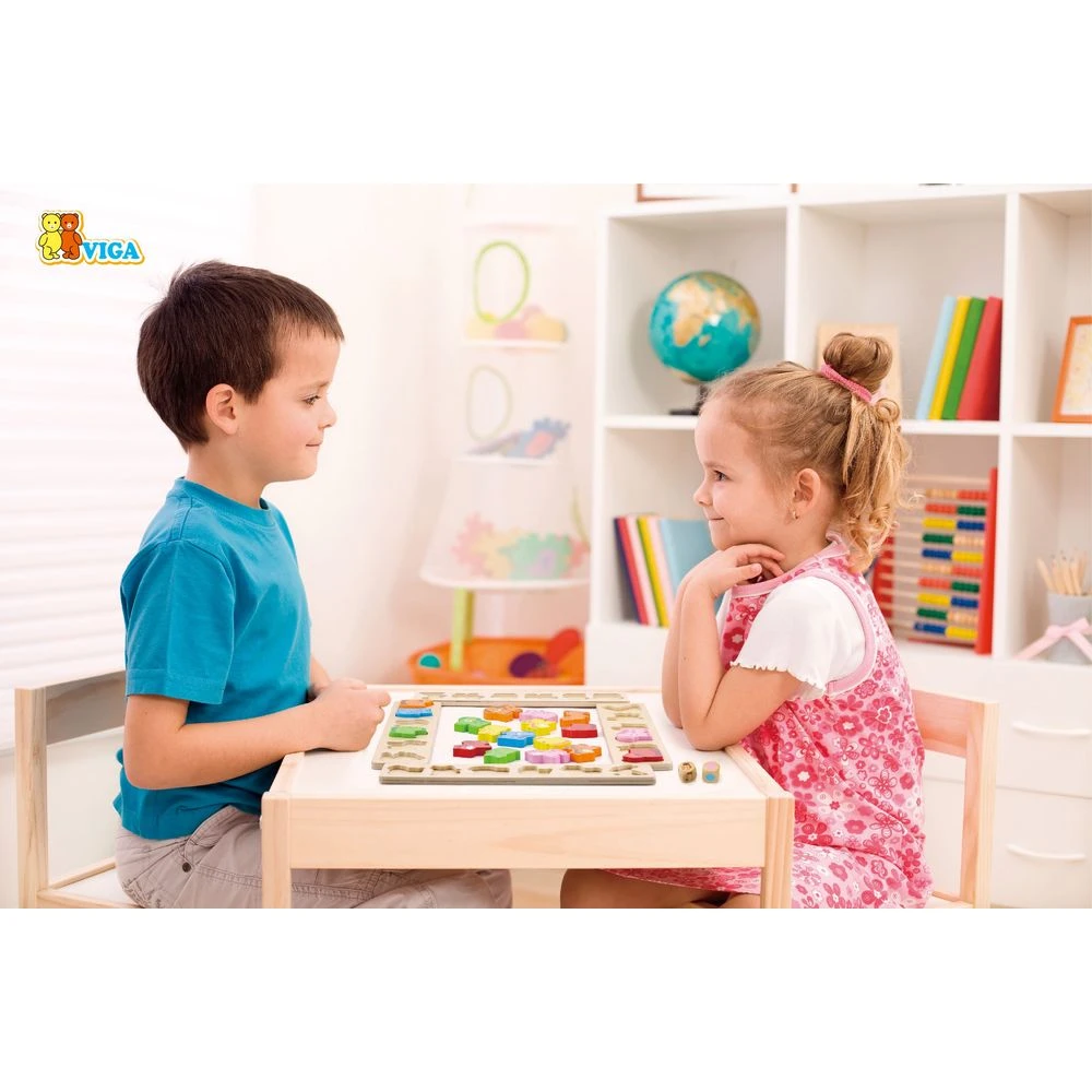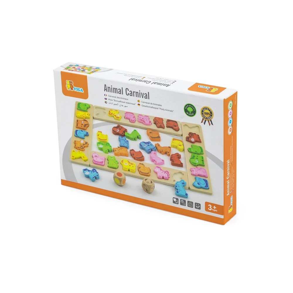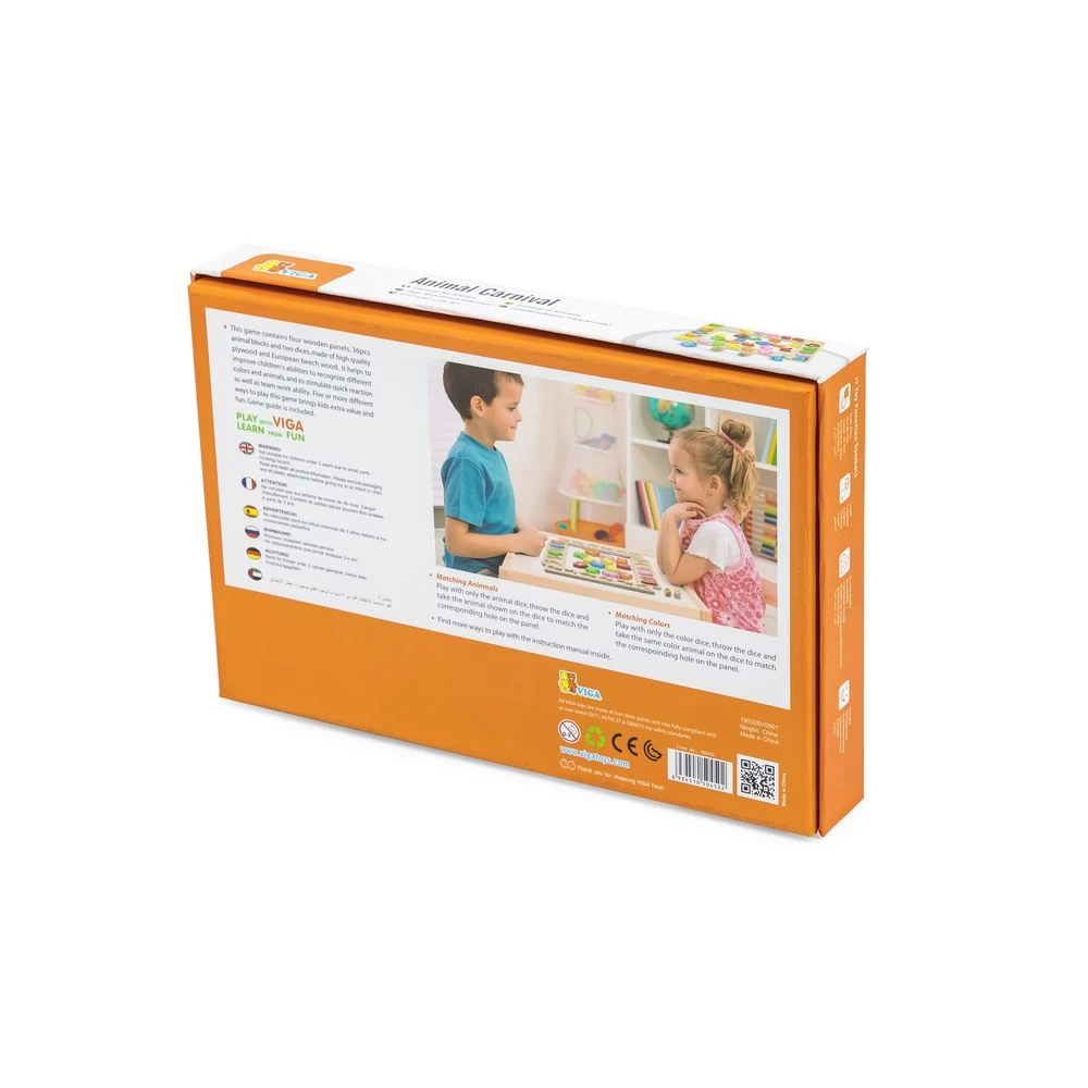 Игра-сортер Карнавал животных Viga Toys состоит из 4 деревянных панелей, 36 фигурок в виде животных, 2 кубиков (один с разными цветами, другой с изображениями животных).
