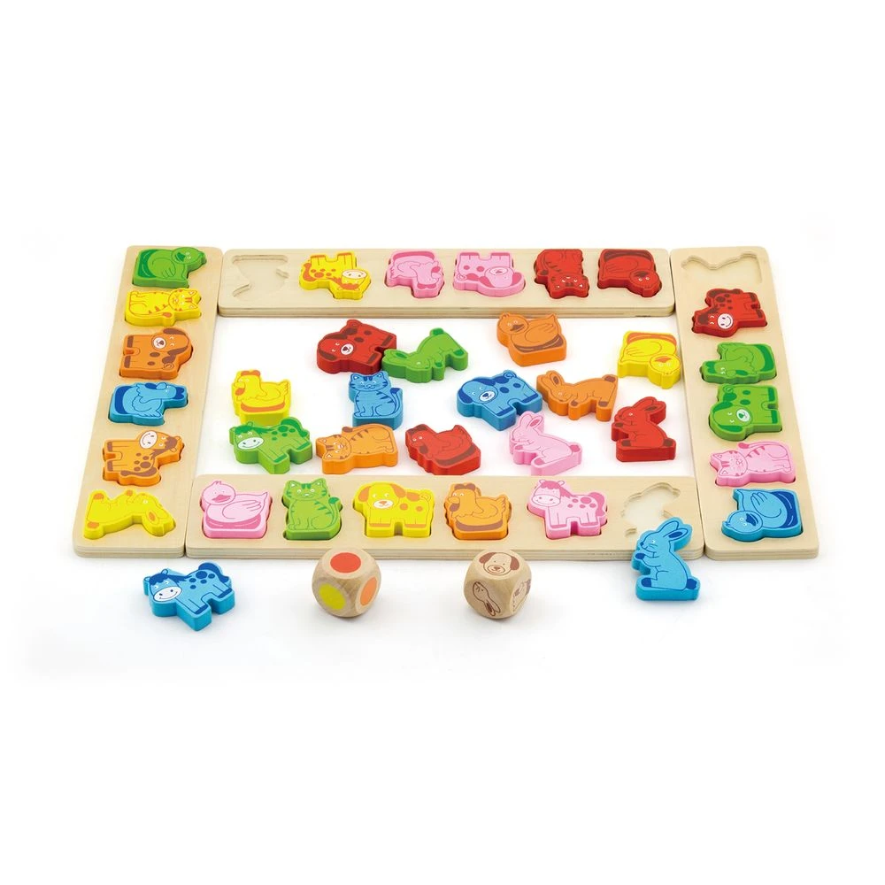 - Бросьте оба кубика, найдите фигурку, соответствующий цвета, и животному, выпавших на кубиках. Поищите соответствующую выемку на панели;