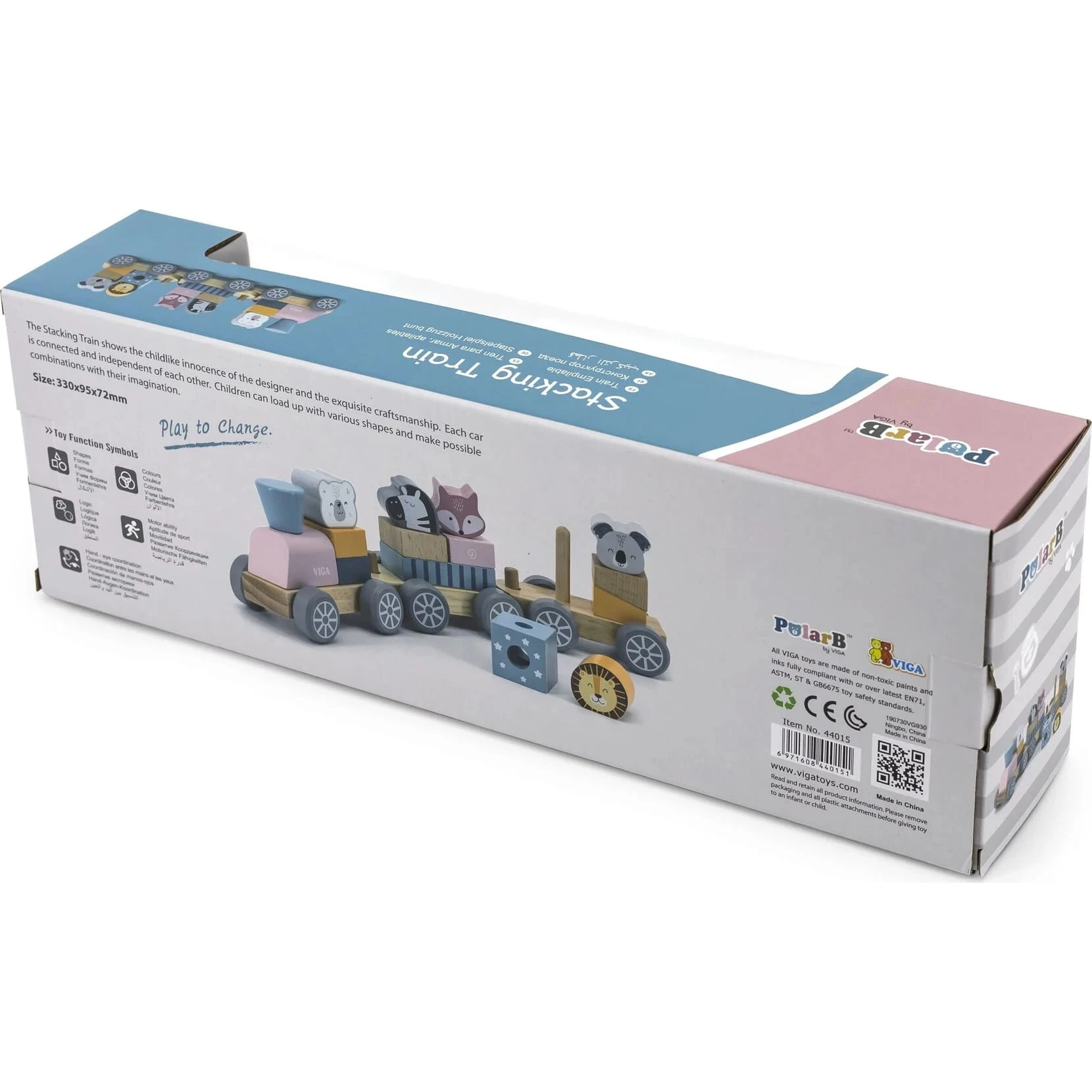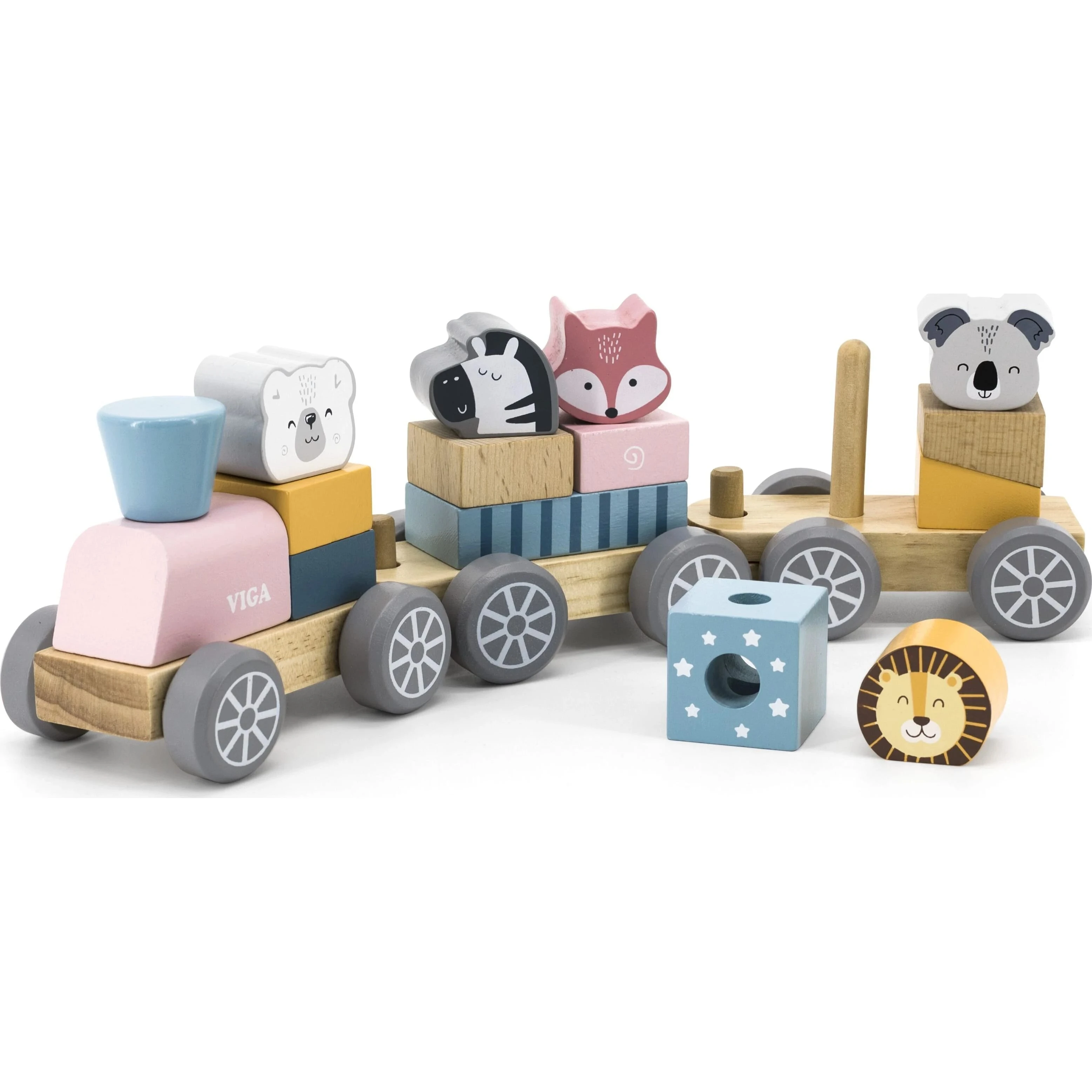 - В состав поезда входят 3 вагона и 15 блоков в 11 цветах и 11 формах, прочно собранных из массивного дерева.