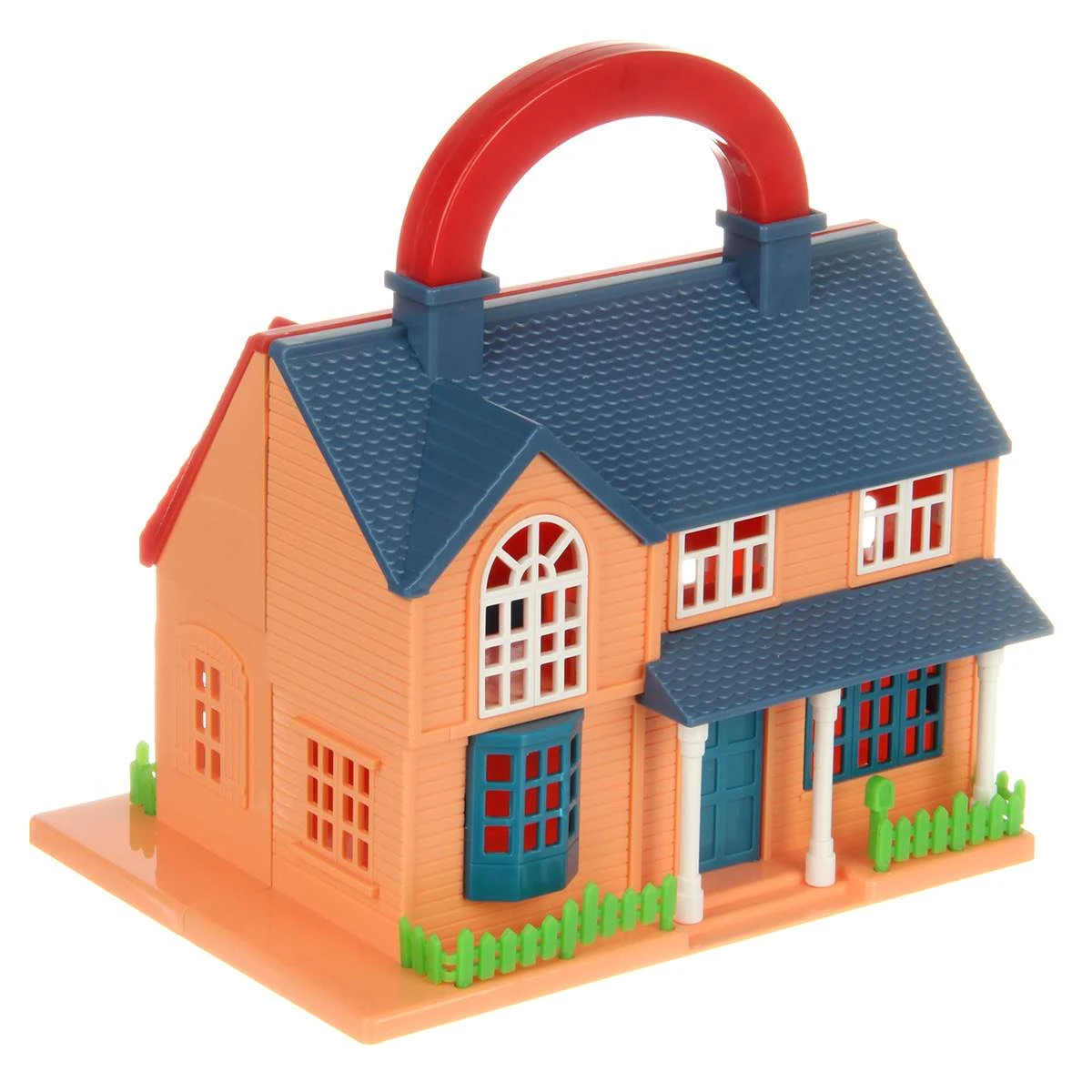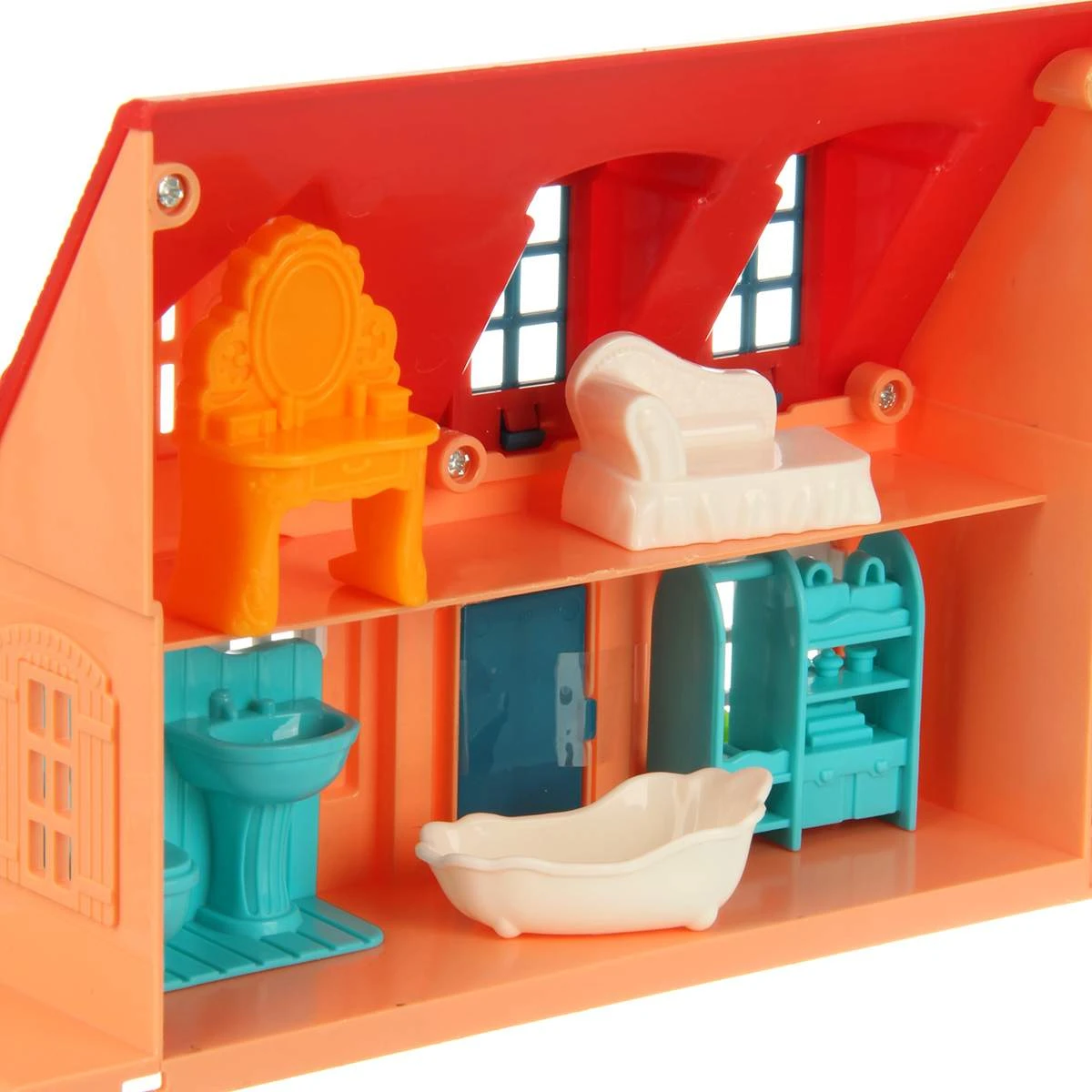 В комплекте домик, кукла, сумочка, 11 предметов мебели, а именно кухонный гарнитур, холодильник, унитаз с раковиной, туалетный столик, диван, стол, 2 стула, стеллаж, кровать, ванна.