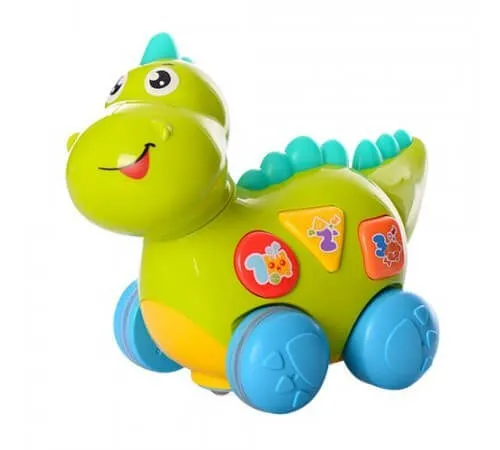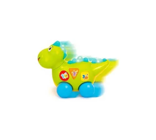 Развивающая игрушка в виде динозавра с мелодиями, звуковыми эффектами, английскими фразами.Нажимая различные кнопки, можно выучить формы, цвета, цифры, буквы, животных и их звуки. Два режима: познавательный и музыкальный. Приятная музыка, красочные световые эффекты, забавные фразы на английском, движения головой и хвостом. Для работы нужны 3 батарейки AA (не в комплекте). Игрушка имеет сертификаты качества и безопасности, среди них европейский EN71.
