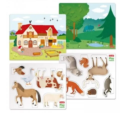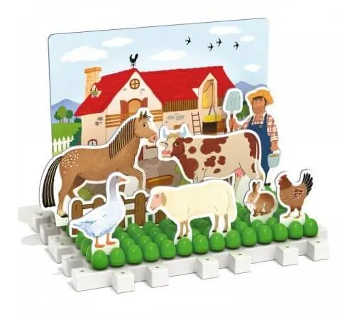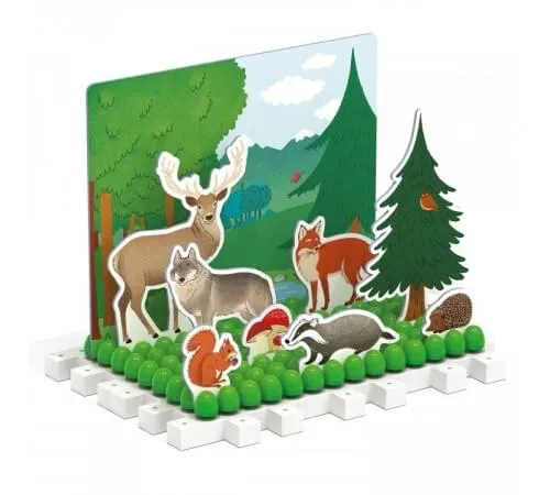 Воссоздай идеальную среду обитания для животных. Два сценария, ферма и лес, и много животных в прочном картоне, которые нужно разместить в нужном месте. Они остаются стоящими благодаря гвоздям, вставленным в опорные плиты, входящие в комплект.