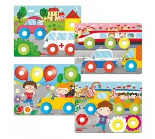 Большие винты и болты из цветного пластика должны быть объединены и привинчены в нужном месте на 4 платформах из прочного картона. Игра, которая стимулирует ручные навыки и ассоциации.