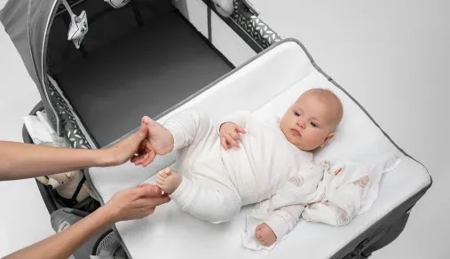 - В комплект модели входит пеленальный столик с приподнятыми краями и функциональными карманами и отделениями для принадлежностей для ухода.