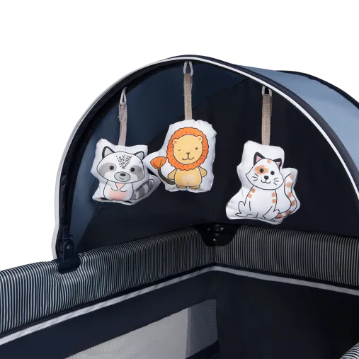 - В набор аксессуаров для модели входит навес с москитной сеткой, поручень с игрушками и интерактивная собачка.