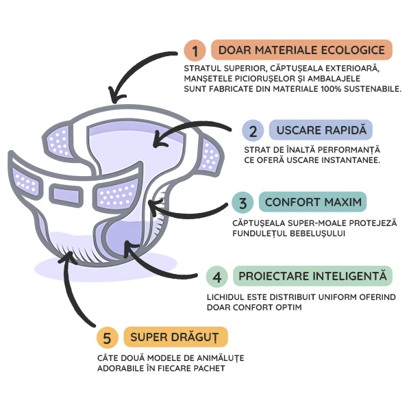 - Наружная и внутренняя часть подгузника изготовлена из 100% экологически чистого материала;