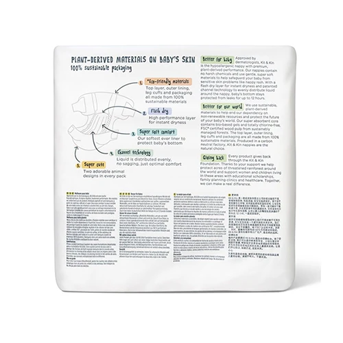 Мы используем экологически чистые материалы растительного происхождения, чтобы помочь нам ограничить нашу зависимость от невозобновляемых ресурсов и защитить будущие ресурсы мира вашего ребенка. Основа наших супервпитывающих подгузников состоит из гелей на биологической основе * и FSC® сертифицированной древесной пасте без хлора из экологически безопасных лесов. Верхний слой, внешняя подкладка, передние панели, манжеты вокруг ног, а также упаковка подгузников изготовлены из 100% прочных и оксо-биоразлагаемых материалов (они могут разлагаться естественным образом за 3-6 лет). Подгузники Kit & Kin производятся на экологически чистой, безуглеродной фабрике.