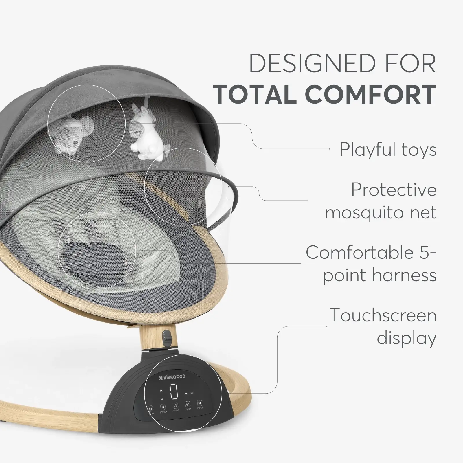 ASHLEE — безопасные, комфортные и умные качели, созданные для успокоения и развлечения малыша с первых дней дома, облегчая при этом жизнь родителей.