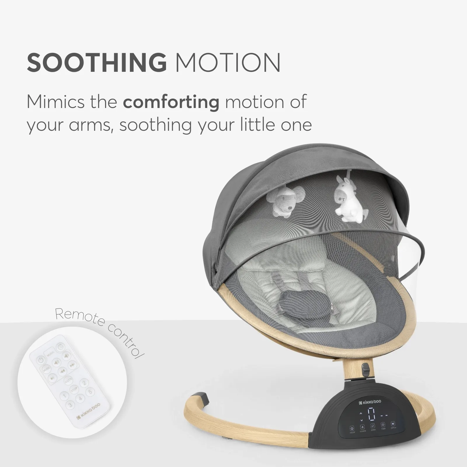 - Пульт дистанционного управления для регулировки качелей и музыки, не беспокоя ребенка.