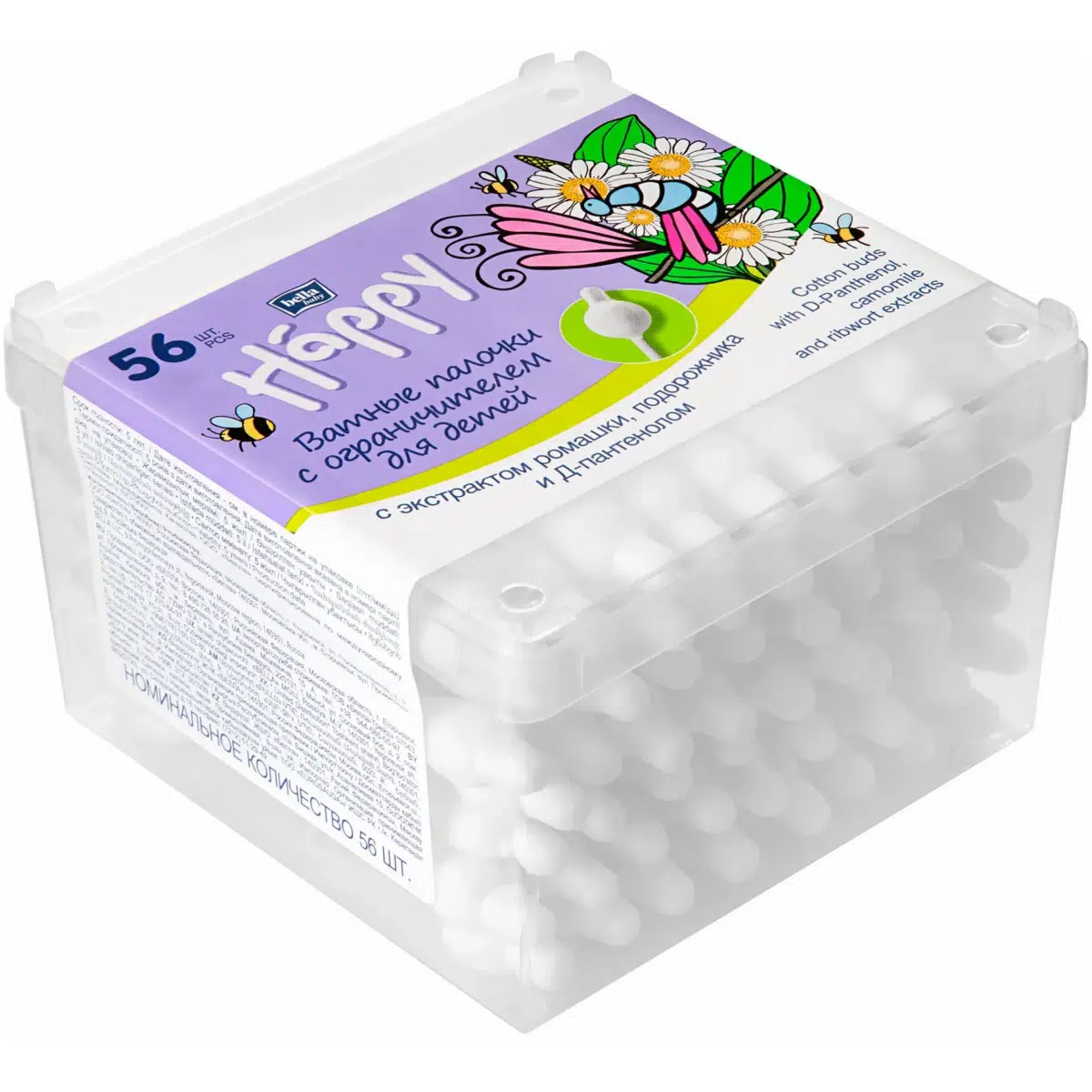 Ватные палочки Bella Baby Happy с экстрактом ромашки, подорожника и Д-пантенолом и с ограничителем, 56 шт.