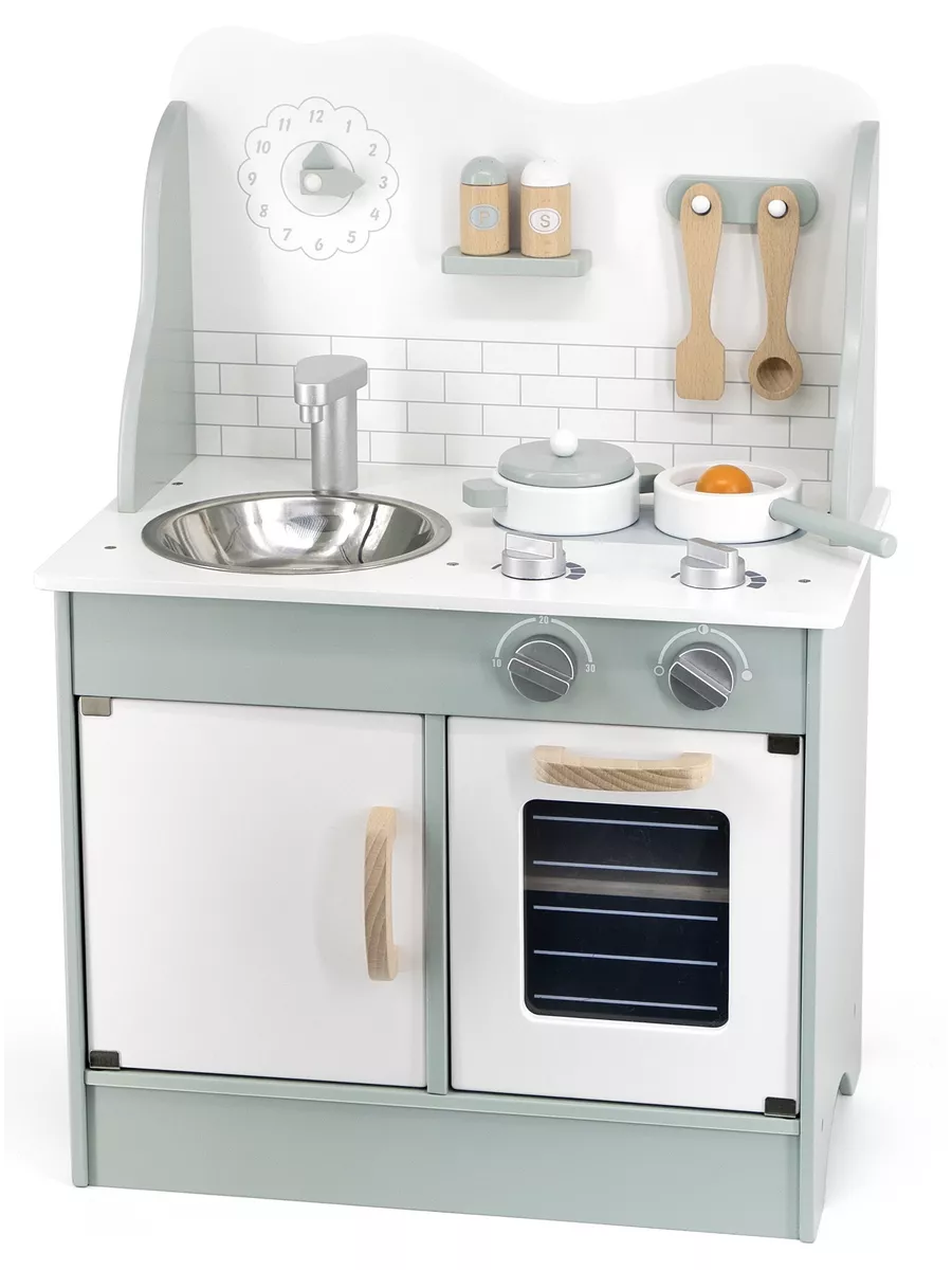 Эта стильная деревянная кухня в пастельных тонах станет идеальным подарком для маленьких кулинаров. Компактная, но многофункциональная, она оснащена всем необходимым для увлекательной игры: раковиной, духовкой, плитой, полочками для аксессуаров и различными кухонными принадлежностями.