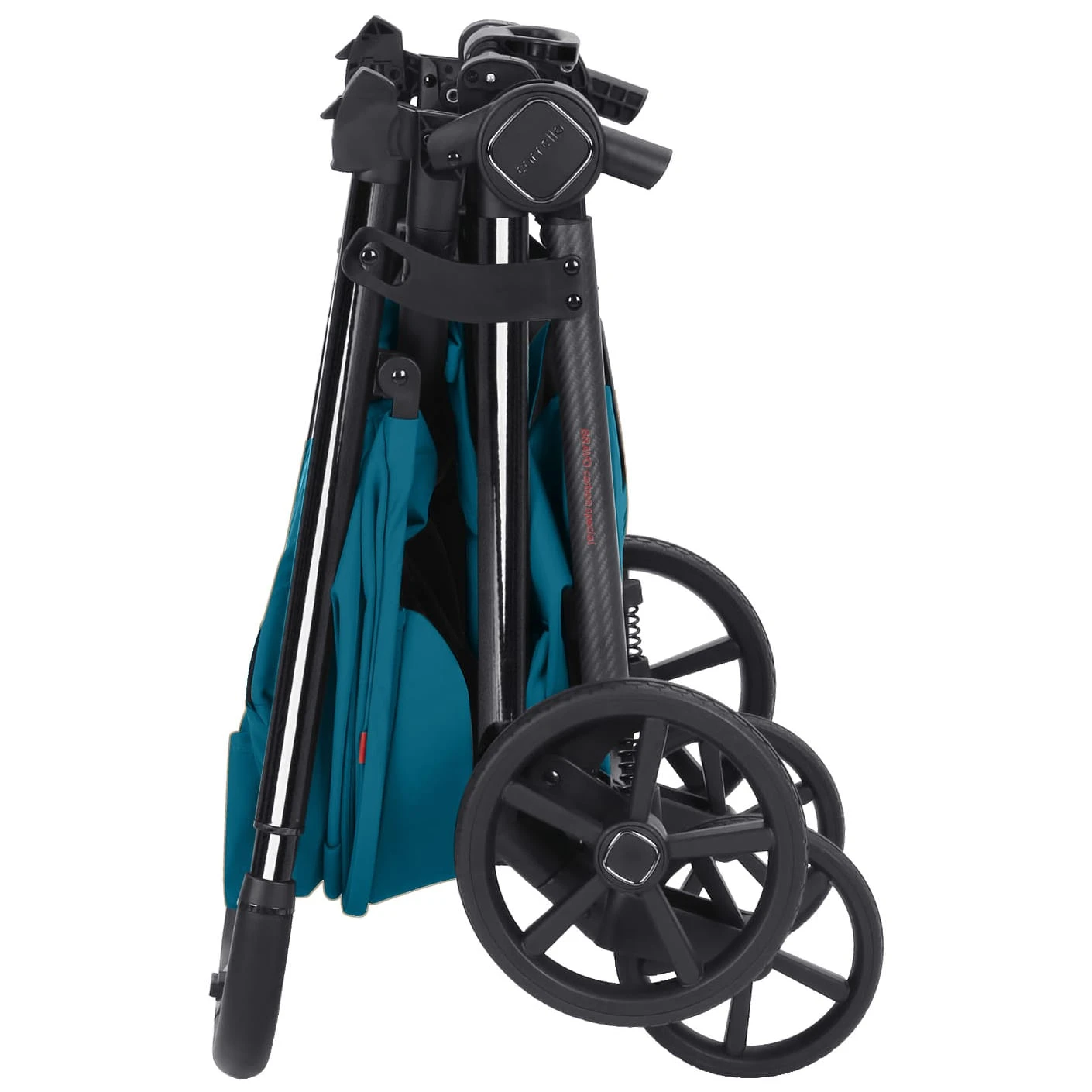 - Коляска складывается сидением внутрь — текстиль сиденья защищен от загрязнений.