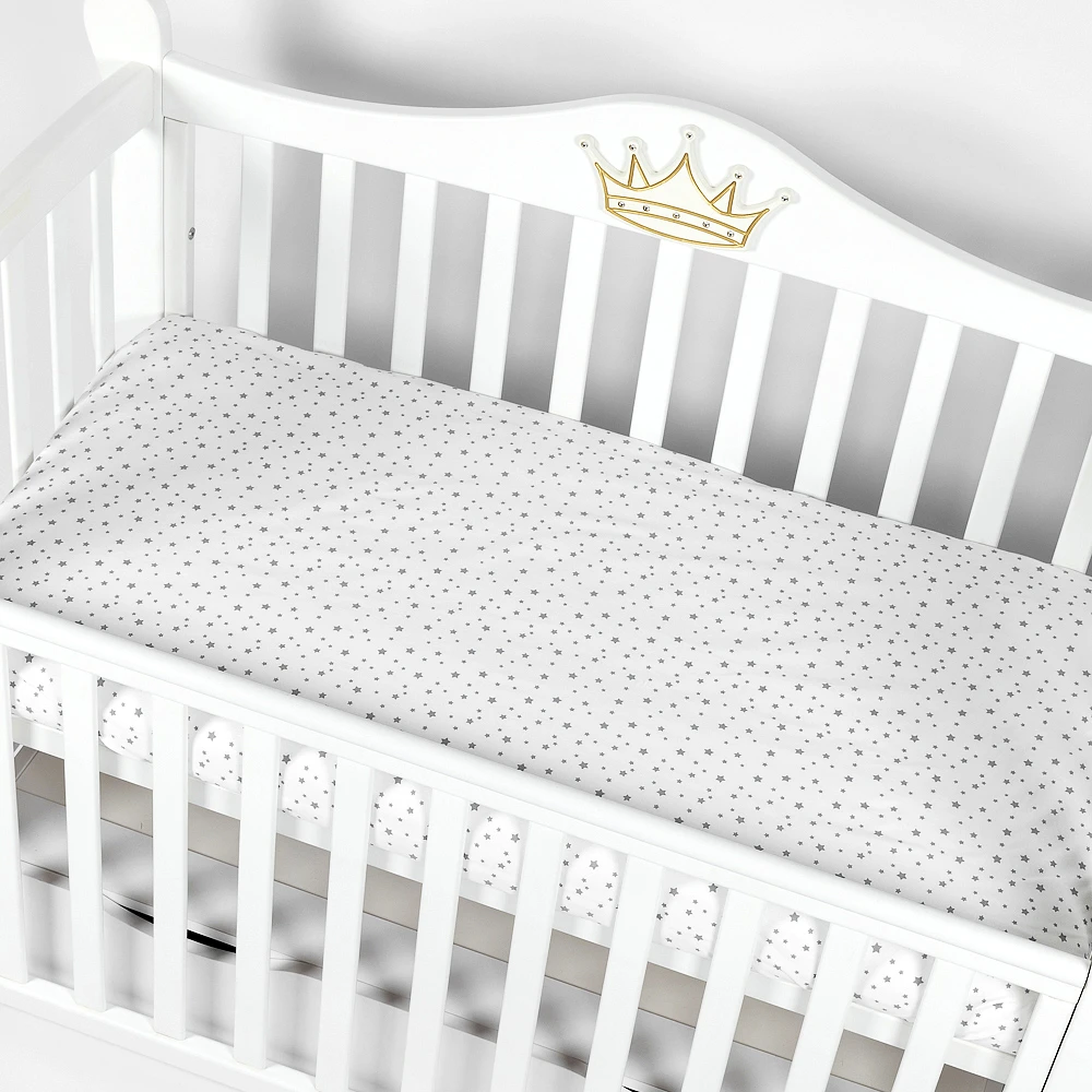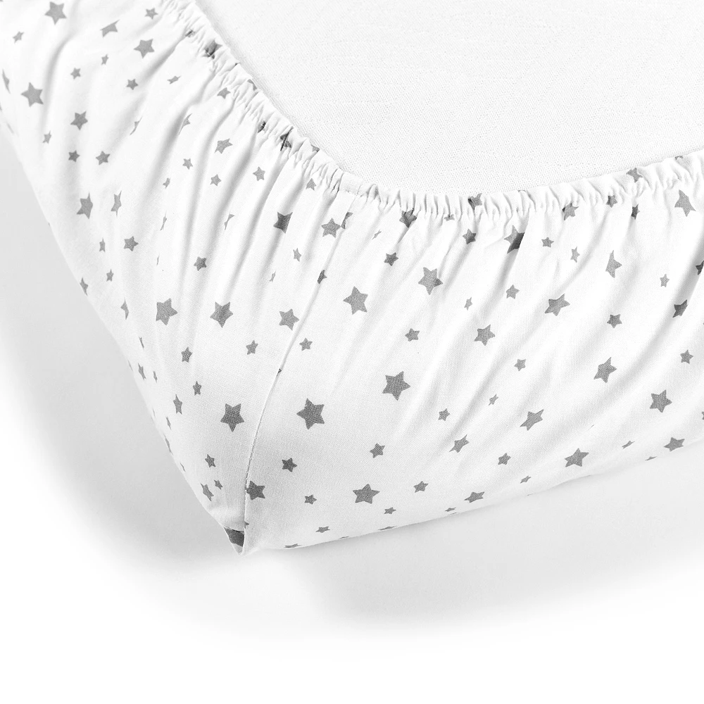 - Дизайн: Белая простынь с очаровательным узором серых звезд станет стильным и элегантным акцентом в детской комнате, легко сочетаясь с различными комплектами постельного белья.