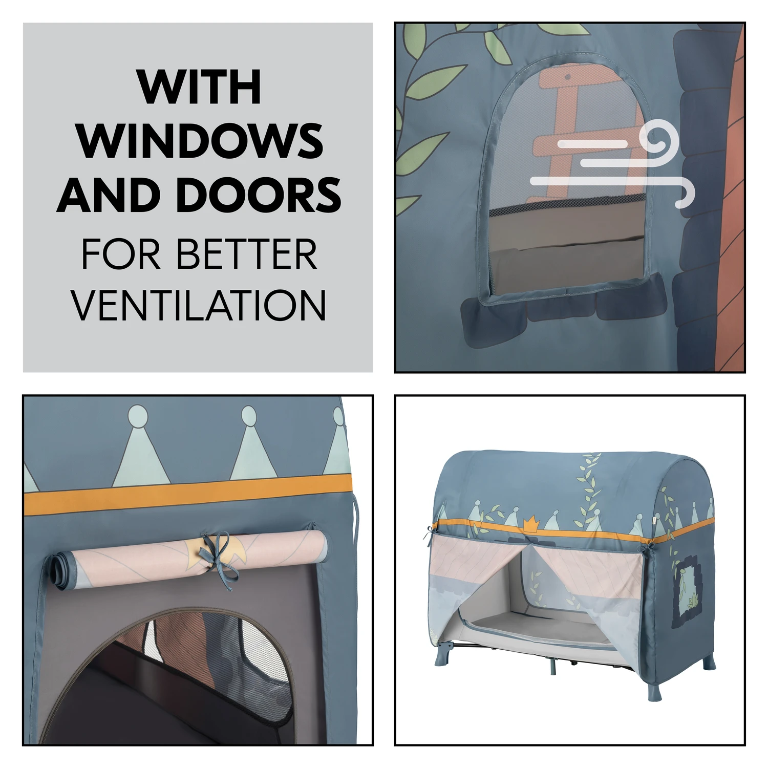 - Легкий вход и выход. Ваш ребенок любит делать все самостоятельно? Он прекрасно справится без вашей помощи в своем дворце или саду. У покрытия Travel Bed Cover есть большой вход спереди и меньший сбоку.