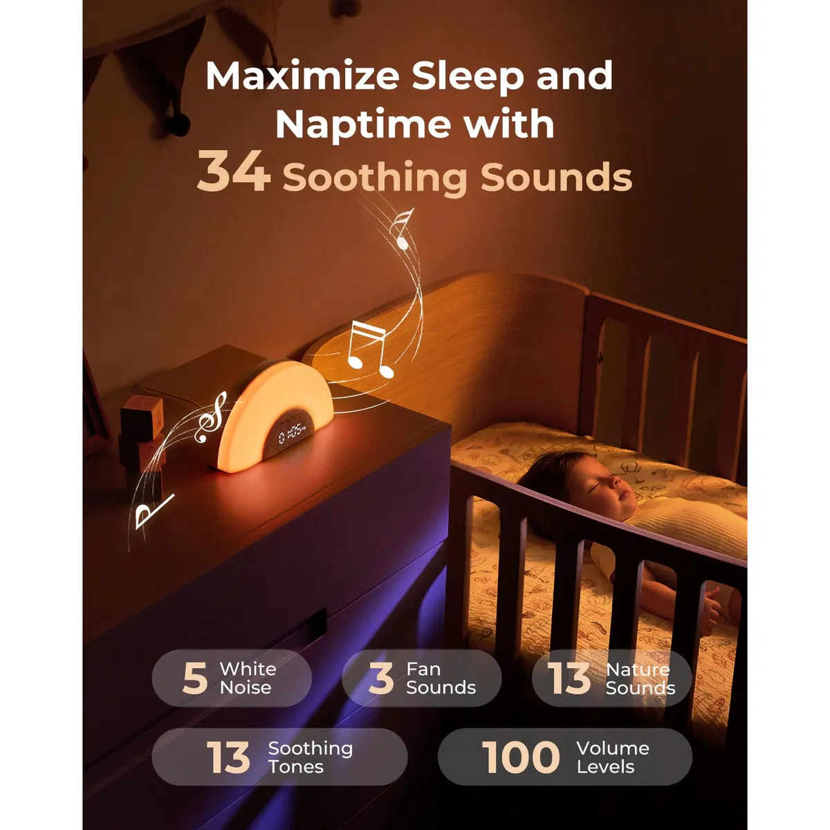- Спокойный сон – более 30 успокаивающих звуков и фонового освещения для релаксации малыша.