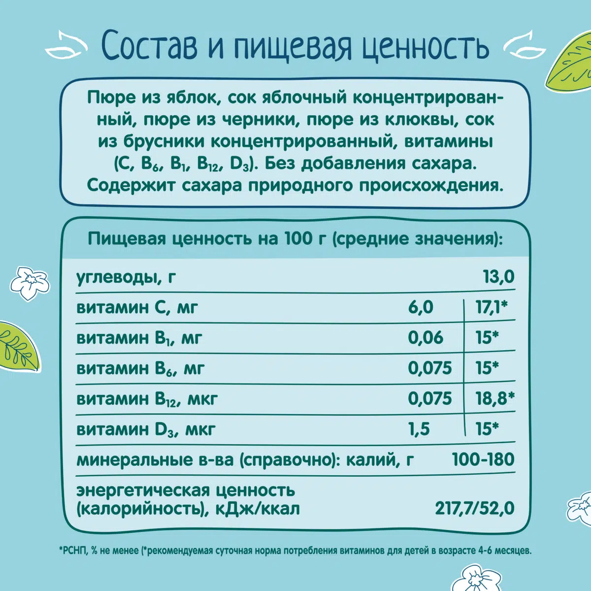 Состав: пюре из яблок, сок яблочный концентрированный, пюре из черники, пюре из клюквы, сок из брусники концентрированный, витамины (С, B6, B1,D3,B12). Без добавления сахара. Содержит сахара природного происхождения.