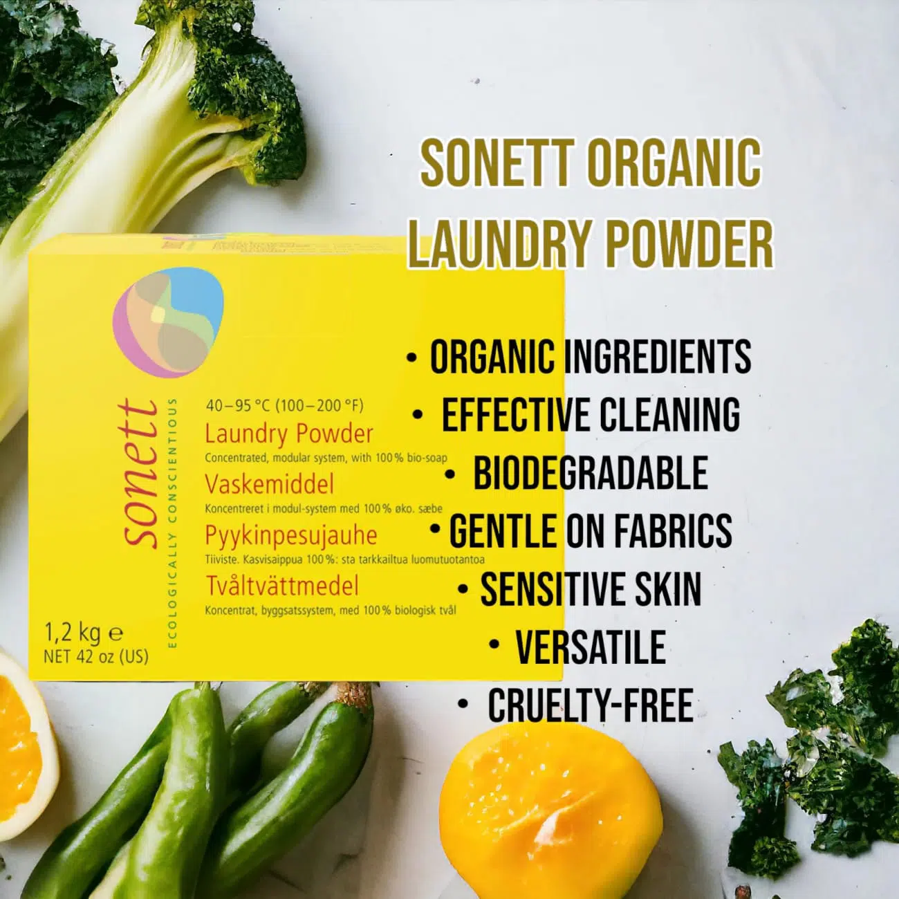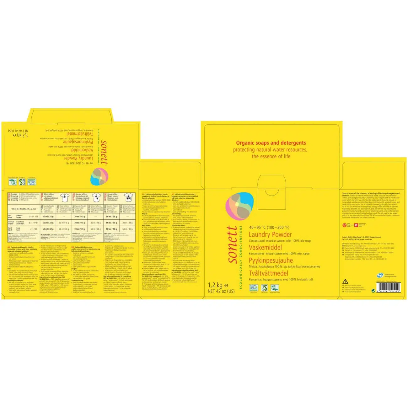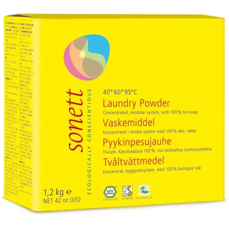 – 1,2 кг = примерно 27 стирок - Не рекомендуется для шерсти, шёлка и деликатных тканей — для них используйте жидкое средство с оливковым маслом Sonett