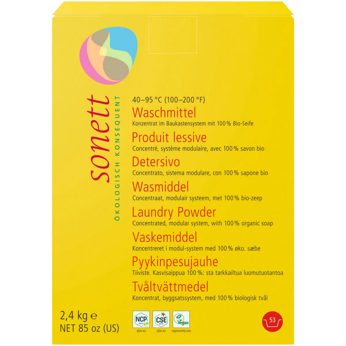 Отлично отстирывает при температурах 40 °C, 60 °C и 95 °C. Это средство часто называют «мыльным порошком», так как его активным ингредиентом является мыло на основе растительных масел.