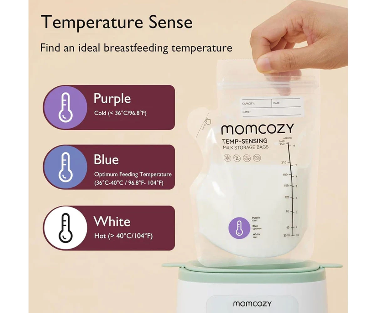 Пакеты для грудного молока Momcozy обеспечивают безопасный, гигиеничный и удобный способ хранения молока. Инновационный дизайн включает индикатор температуры, градуировку и двойную систему защиты от протеканий.